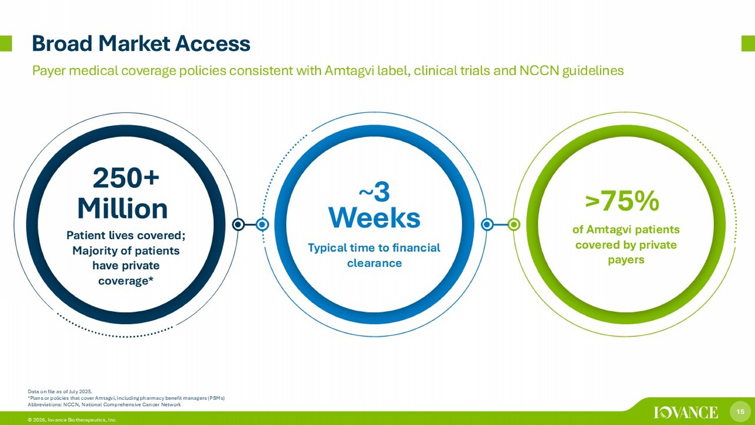 14 © 2026, Iovance Biotherapeutics, Inc. Amtagvi ® Authorized Treatment Centers (ATC) AMTAGVI® IN PREVIOUSLY TREATED ADVANCED MELANOMA 10K+ ≤ 100 Population 2 1. Not all authorized treatment centers are listed, Includes onboarded ATCs as well as in - process ATCs. 2. U.S. Census Bureau, 2024 Annual Estimates. SEER annual estimated death rate from melanoma: 2 deaths per 100K people: https://seer.cancer.gov/ (accessed April 2025) 3. Internal data