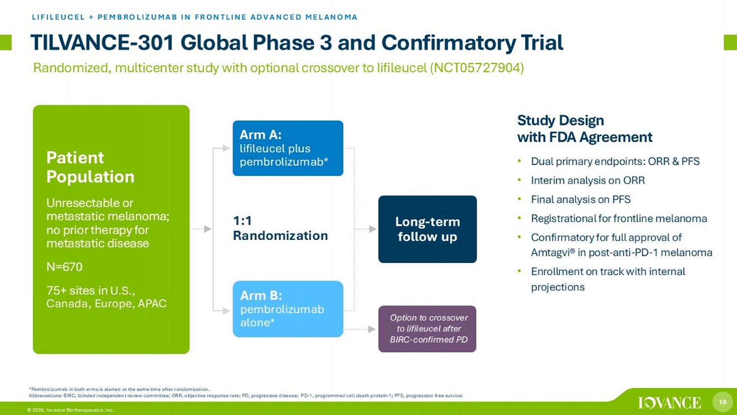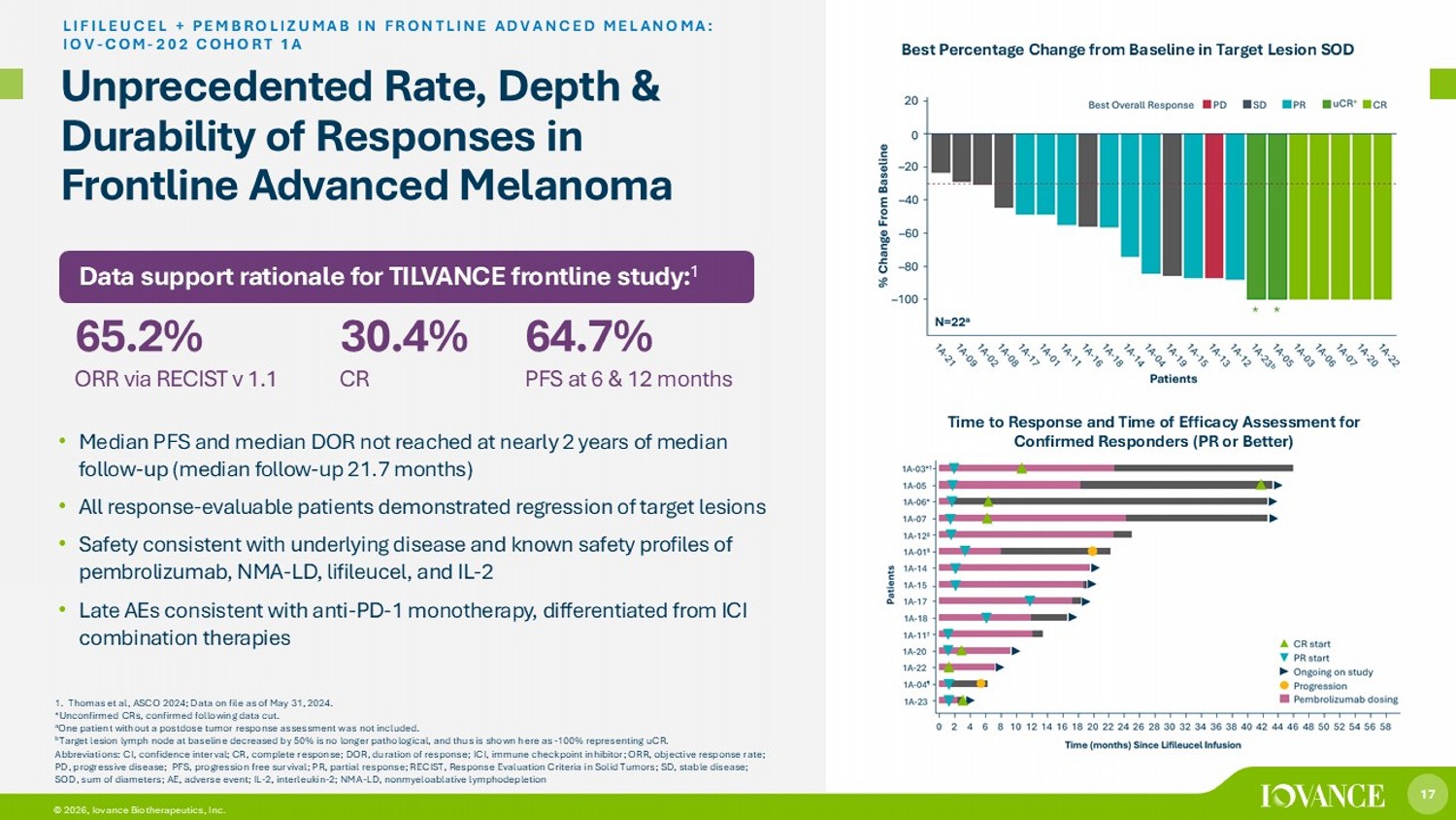 17 © 2026, Iovance Biotherapeutics, Inc. Unprecedented Rate, Depth & Durability of Responses in Frontline Advanced Melanoma • Median PFS and median DOR not reached at nearly 2 years of median follow - up (median follow - up 21.7 months) • All response - evaluable patients demonstrated regression of target lesions • Safety consistent with underlying disease and known safety profiles of pembrolizumab, NMA - LD, lifileucel, and IL - 2 • Late AEs consistent with anti - PD - 1 monotherapy, differentiated from ICI combination therapies LIFILEUCEL + PEMBROLIZUMAB IN FRONTLINE ADVANCED MELANOMA: IOV - COM - 202 COHORT 1A 1. Thomas et al, ASCO 2024; Data on file as of May 31, 2024. *Unconfirmed CRs, confirmed following data cut. a One patient without a postdose tumor response assessment was not included. b Target lesion lymph node at baseline decreased by 50% is no longer pathological, and thus is shown here as - 100% representing uCR. Abbreviations: CI, confidence interval; CR, complete response; DOR, duration of response; ICI, immune checkpoint inhibitor; O RR, objective response rate; PD, progressive disease; PFS, progression free survival; PR, partial response; RECIST, Response Evaluation Criteria in Solid Tu mors; SD, stable disease; SOD, sum of diameters; AE, adverse event; IL - 2, interleukin - 2; NMA - LD, nonmyeloablative lymphodepletion Data support rationale for TILVANCE frontline study: 1 65.2% ORR via RECIST v 1.1 30.4% CR 64.7% PFS at 6 & 12 months Best Percentage Change from Baseline in Target Lesion SOD Time to Response and Time of Efficacy Assessment for Confirmed Responders (PR or Better)