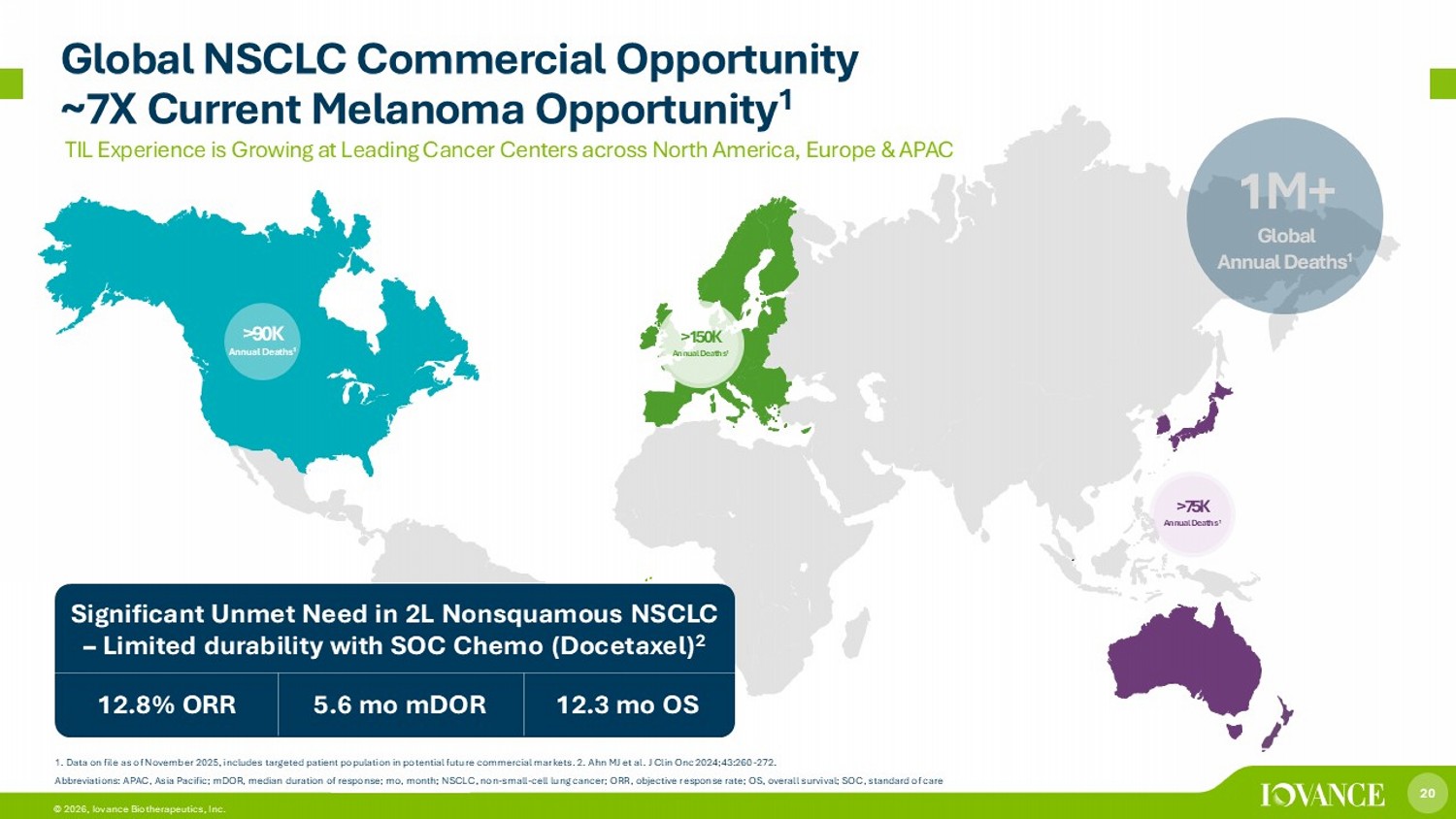 20 © 2026, Iovance Biotherapeutics, Inc. 1M+ Global Annual Deaths 1 Significant Unmet Need in 2L Nonsquamous NSCLC – Limited durability with SOC Chemo (Docetaxel) 2 5.6 mo mDOR 12.3 mo OS 12.8% ORR >90K Annual Deaths 1 1. Data on file as of November 2025, includes targeted patient population in potential future commercial markets. 2. Ahn MJ et al. J Clin Onc 2024;43:260 - 272. Abbreviations: APAC, Asia Pacific; mDOR, median duration of response; mo , month; NSCLC, non - small - cell lung cancer; ORR, objective response rate; OS, overall survival; SOC, standard of care >150K Annual Deaths 1 >75K Annual Deaths 1 TIL Experience is Growing at Leading Cancer Centers across North America, Europe & APAC Global NSCLC Commercial Opportunity ~7X Current Melanoma Opportunity 1
