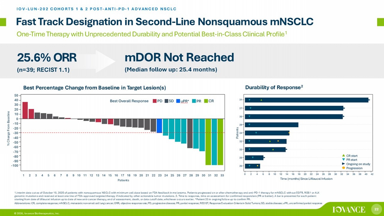 21 © 2026, Iovance Biotherapeutics, Inc. IOV - LUN - 202 Registrational Trial Design Phase 2 Multicenter Study of Lifileucel in Post - Anti - PD - 1 NSCLC (NCT04614103) Abbreviations: Anti - PD - 1, anti - programmed cell death inhibitor; IRC, independent review committee; NSCLC, non - small cell lung ca ncer; ORR, objective response rate; TPS, tumor proportion score Iovance TIL Therapy Lifileucel in NSCLC IOV - LUN - 202 is designed to enroll patients with advanced NSCLC post anti - PD - 1 treatment Endpoints • Primary: ORR by IRC • Secondary: Safety Patient Population Unresectable or metastatic NSCLC with progression on or after prior anti - PD - 1 treatment and chemotherapy 65+ sites in U.S., Canada, Europe, APAC Cohort 1: < 1% or unknown TPS Cohort 2: ≥ 1% TPS Registrational Cohorts