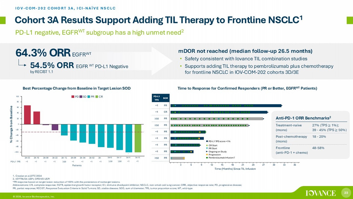 23 © 2026, Iovance Biotherapeutics, Inc. Cohort 3A Results Support Adding TIL Therapy to Frontline NSCLC 1 IOV - COM - 202 COHORT 3A, ICI - NAÏVE NSCLC % Change from Baseline Time (Months) Since TIL Infusion PD - L1 negative, EGFR WT subgroup has a high unmet need 2 Best Percentage Change from Baseline in Target Lesion SOD 64.3% ORR EGFR WT Time to Response for Confirmed Responders (PR or Better, EGFR WT Patients) mDOR not reached (median follow - up 26.5 months) • Safety consistent with Iovance TIL combination studies • Supports adding TIL therapy to pembrolizumab plus chemotherapy for frontline NSCLC in IOV - COM - 202 cohorts 3D/3E 1. Creelan et al,SITC 2024 2 . KEYTRUDA USPI; OPDIVO USPI *PR response based on target lesion reduction of 100% with the persistence of nontarget lesions. Abbreviations: CR, complete response; EGFR, epidermal growth factor receptor; ICI, immune checkpoint inhibitor; NSCLC, non - small - cell lung cancer; ORR, objective response rate; PD, progressive disease; PR, partial response; RECIST, Response Evaluation Criteria in Solid Tumors; SD, stable disease; SOD, sum of diameter; TPS, tumor proportion score; WT, wild - type 54.5% ORR EGFR WT PD - L1 Negative by RECIST 1.1 Anti - PD - 1 ORR Benchmarks 2 27% (TPS ≥ 1%); 39 - 45% (TPS ≥ 50%) Treatment - naïve (mono) 18 - 20% Post - chemotherapy (mono) 48 - 58% Frontline (anti - PD - 1 + chemo) 2 Patients 60 40 20 0 – 20 – 40 – 60 – 80 – 100 a 3A - 03 3A - 16 3A - 08 3A - 22 3A - 15 3A - 09 3A - 04 3A - 02 3A - PD - L1 TPS <1 <1 <1 <1 ≥ 50 <1 <1 <1 <1 3A - 10 ≥ 50 3A - 17 ≥ 50 3A - 11 <1 3A - 13 <1 8 0 10 0 PD SD PR CR