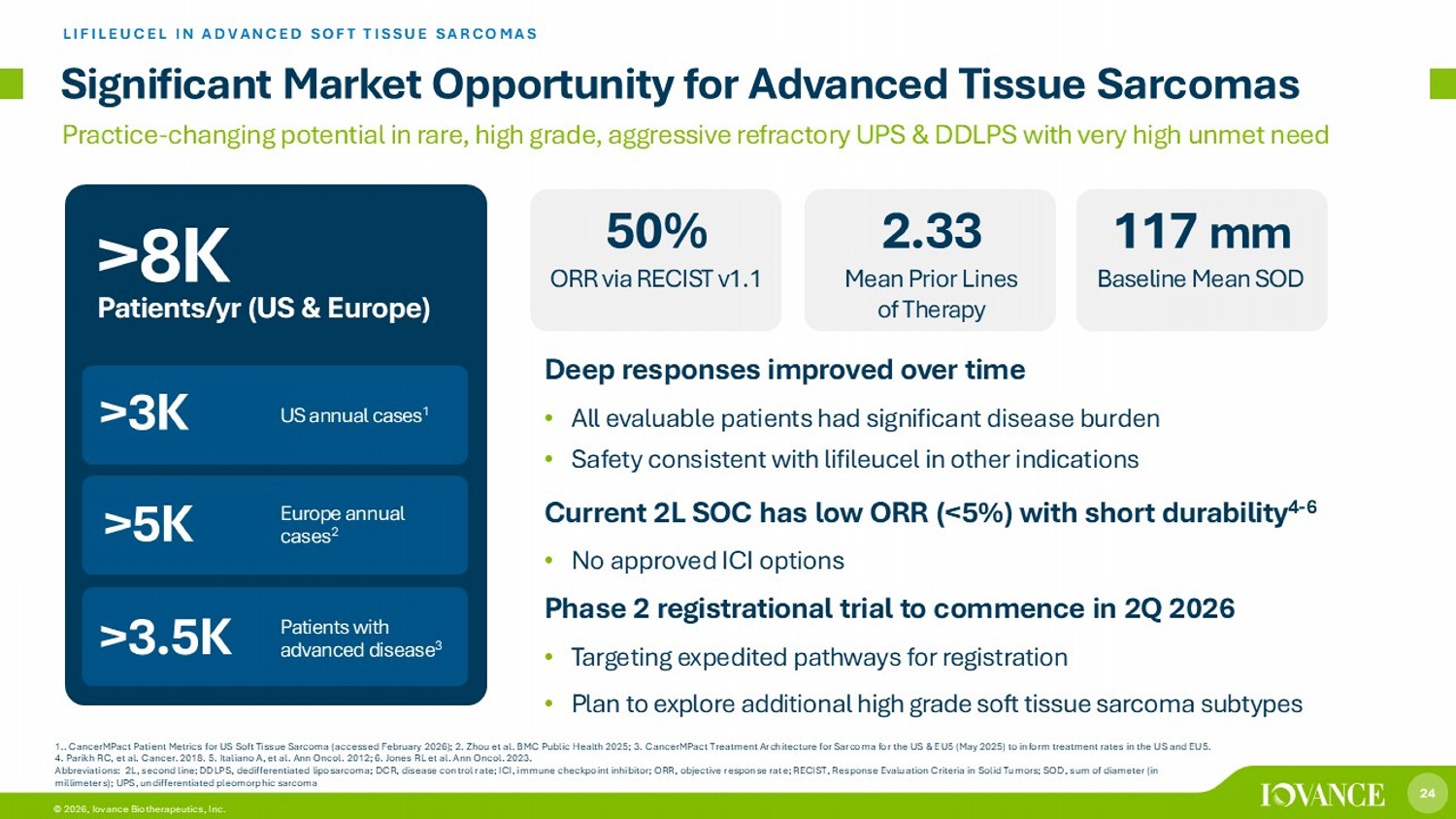 24 © 2026, Iovance Biotherapeutics, Inc. 1.. CancerMPact Patient Metrics for US Soft Tissue Sarcoma (accessed February 2026); 2. Zhou et al. BMC Public Health 2025; 3. CancerMPact Treatment Architecture for Sarcoma for the US & EU5 (May 2025) to inform treatment rates in the US and EU5. 4. Parikh RC, et al. Cancer. 2018. 5. Italiano A, et al. Ann Oncol. 2012; 6. Jones RL et al. Ann Oncol. 2023. Abbreviations: 2L, second line; DDLPS, dedifferentiated liposarcoma; DCR, disease control rate; ICI, immune checkpoint inhibitor; ORR, objective response rat e; RECIST, Response Evaluation Criteria in Solid Tumors; SOD, sum of diameter (in millimeters); UPS, undifferentiated pleomorphic sarcoma Significant Market Opportunity for Advanced Tissue Sarcomas LIFILEUCEL IN ADVANCED SOFT TISSUE SARCOMAS Practice - changing potential in rare, high grade, aggressive refractory UPS & DDLPS with very high unmet need Deep responses improved over time • All evaluable patients had significant disease burden • Safety consistent with lifileucel in other indications Current 2L SOC has low ORR (<5%) with short durability 4 - 6 • No approved ICI options Phase 2 registrational trial to commence in 2Q 2026 • Targeting expedited pathways for registration • Plan to explore additional high grade soft tissue sarcoma subtypes >3 K >5K US annual cases 1 Patients with advanced disease 3 Europe annual cases 2 >3.5K >8K Patients/yr (US & Europe) 50% ORR via RECIST v1.1 2.33 Mean Prior Lines of Therapy 117 mm Baseline Mean SOD