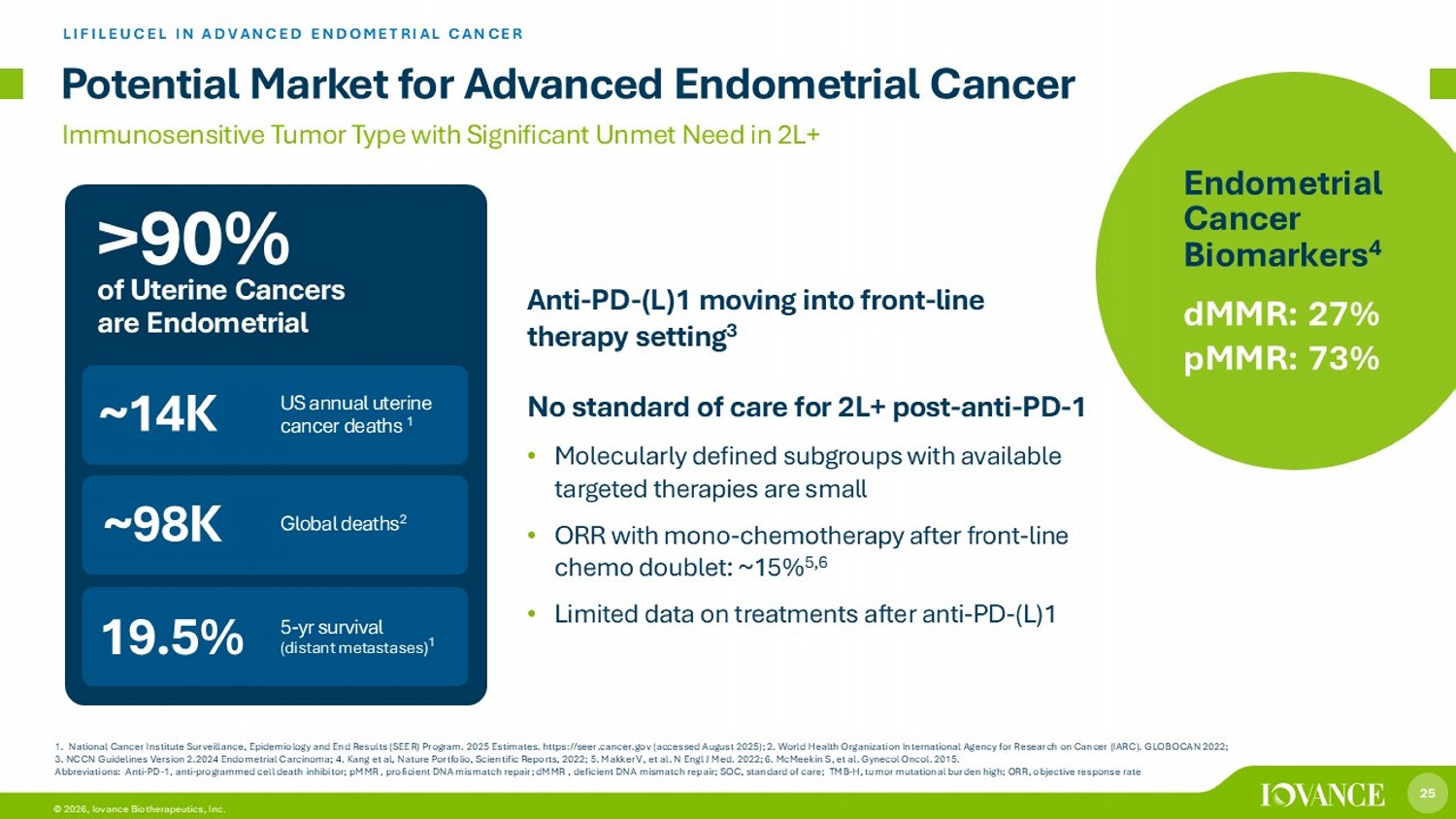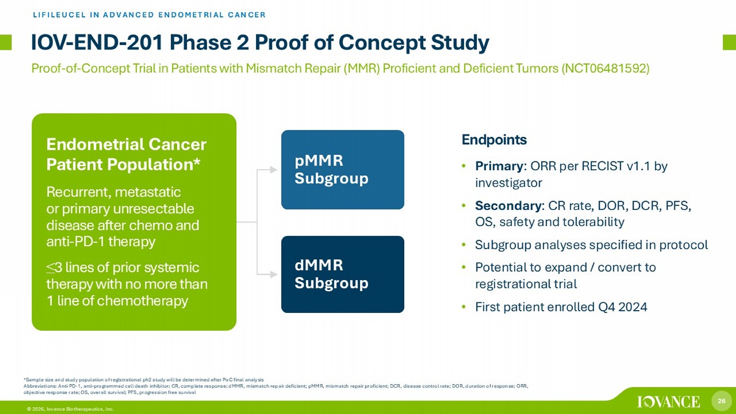 25 © 2026, Iovance Biotherapeutics, Inc. 1. National Cancer Institute Surveillance, Epidemiology and End Results (SEER) Program. 2025 Estimates. https://seer.cancer.gov (accessed August 2025); 2. World Health Organization International Agency for Research on Cancer (IARC). GLOBOCAN 2022; 3. NCCN Guidelines Version 2.2024 Endometrial Carcinoma; 4. Kang et al, Nature Portfolio, Scientific Reports, 2022; 5. Makker V, et al. N Engl J Med. 2022; 6. McMeekin S, et al. Gynecol Oncol. 2015. Abbreviations: Anti - PD - 1, anti - programmed cell death inhibitor; pMMR , proficient DNA mismatch repair; dMMR , deficient DNA mismatch repair; SOC, standard of care; TMB - H, tumor mutational burden high; ORR, objective response rate Potential Market for Advanced Endometrial Cancer LIFILEUCEL IN ADVANCED ENDOMETRIAL CANCER Immunosensitive Tumor Type with Significant Unmet Need in 2L+ Anti - PD - (L)1 moving into front - line therapy setting 3 No standard of care for 2L+ post - anti - PD - 1 • Molecularly defined subgroups with available targeted therapies are small • ORR with mono - chemotherapy after front - line chemo doublet: ~15% 5,6 • Limited data on treatments after anti - PD - (L)1 ~14K ~98K US annual uterine cancer deaths 1 5 - yr survival ( distant metastases ) 1 Global deaths 2 19.5% Endometrial Cancer Biomarkers 4 dMMR : 27% pMMR : 73% >90% of Uterine Cancers are Endometrial