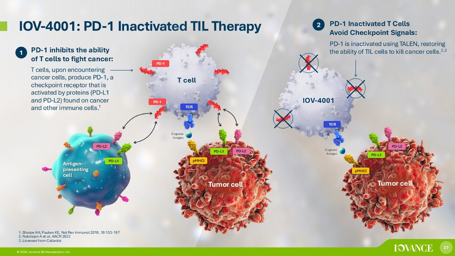 27 © 2026, Iovance Biotherapeutics, Inc. 27 © 2026, Iovance Biotherapeutics, Inc. IOV - 4001: PD - 1 Inactivated TIL Therapy 2 T cell PD - 1 PD - 1 inhibits the ability of T cells to fight cancer: T cells, upon encountering cancer cells, produce PD - 1, a checkpoint receptor that is activated by proteins (PD - L1 and PD - L2) found on cancer and other immune cells. 1 PD - L2 PD - L1 PD - 1 TCR pMHCI PD - L2 PD - L1 Tumor cell Antigen - presenting cell 1. Sharpe AH, Pauken KE, Nat Rev Immunol 2018, 18:153 - 167 2. Natarajan A et.al. AACR 2022 3. Licensed from Cellectis 1 IOV - 4001 TCR pMHCI PD - L2 PD - L1 Tumor cell PD - 1 Inactivated T Cells Avoid Checkpoint Signals: PD - 1 is inactivated using TALEN, restoring the ability of TIL cells to kill cancer cells. 2,3 Cognate Antigen Cognate Antigen