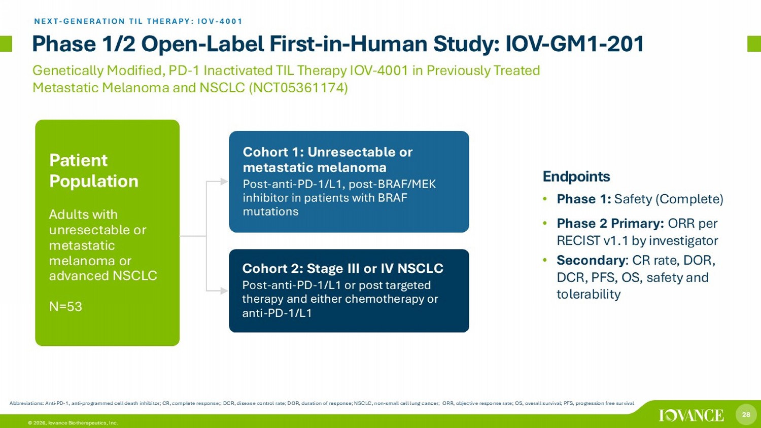 28 © 2026, Iovance Biotherapeutics, Inc. Phase 1/2 Open - Label First - in - Human Study: IOV - GM1 - 201 Endpoints • Phase 1: Safety (Complete) • Phase 2 Primary: ORR per RECIST v1.1 by investigator • Secondary : CR rate , DOR, DCR, PFS, OS, safety and tolerability Genetically Modified, PD - 1 Inactivated TIL Therapy IOV - 4001 in Previously Treated Metastatic Melanoma and NSCLC (NCT05361174) Cohort 1: Unresectable or metastatic melanoma Post - anti - PD - 1/L1, post - BRAF/MEK inhibitor in patients with BRAF mutations Cohort 2: Stage III or IV NSCLC Post - anti - PD - 1/L1 or post targeted therapy and either chemotherapy or anti - PD - 1/L1 Patient Population Adults with unresectable or metastatic melanoma or advanced NSCLC N=53 NEXT - GENERATION TIL THERAPY: IOV - 4001 Abbreviations: Anti - PD - 1, anti - programmed cell death inhibitor; CR, complete response;; DCR, disease control rate; DOR, duration of response; NSCLC, non - small cell lung cancer; ORR, objective response rate; OS, overall survival; PFS, progression free survival