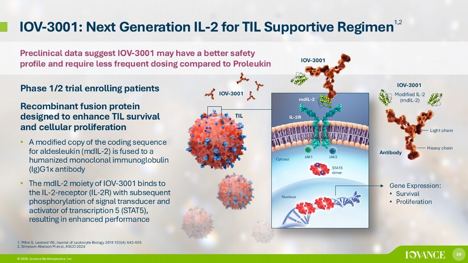 29 © 2026, Iovance Biotherapeutics, Inc. 29 © 2026, Iovance Biotherapeutics, Inc. IOV - 3001: Next Generation IL - 2 for TIL Supportive Regimen 1,2 Phase 1/2 trial enrolling patients Recombinant fusion protein designed to enhance TIL survival and cellular proliferation • A modified copy of the coding sequence for aldesleukin (mdIL - 2) is fused to a humanized monoclonal immunoglobulin (Ig)G1 κ antibody • The mdIL - 2 moiety of IOV - 3001 binds to the IL - 2 - receptor (IL - 2R) with subsequent phosphorylation of signal transducer and activator of transcription 5 (STAT5), resulting in enhanced performance 1. Mitra S, Leonard WJ, Journal of Leukocyte Biology 2018 103(4): 643 - 655 2. Simpson - Abelson M et al, ASCO 2024 Gene Expression: • Survival • Proliferation mdIL - 2 IL - 2R JAK1 P JAK3 STAT5 dimer Cytosol Nucleus P IOV - 3001 IOV - 3001 Heavy chain Light chain IOV - 3001 Modified IL - 2 (mdIL - 2) TIL Antibody Preclinical data suggest IOV - 3001 may have a better safety profile and require less frequent dosing compared to Proleukin