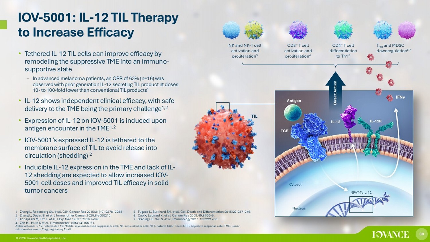 30 © 2026, Iovance Biotherapeutics, Inc. IOV - 5001: IL - 12 TIL Therapy to Increase Efficacy 1. Zhang L, Rosenberg SA, et al, Clin Cancer Res 2015;21(10):2278 – 2288 2. Zhang L, Davis JS, et al, J Immunother Cancer 2020;8:e000210 3. Kobayashi M, Fitz L, et al, J Exp Med 1989;170:827 – 845. 4. Zeh HJ, Hurd S et al, J Immunother 1993;14:155 – 61. 5. Tugues S, Burkhard SH, et al, Cell Death and Differentiation 2015;22:237 – 246. 6. Cao X, Leonard K, et al, Cancer Res 2009;69:8700 – 9. 7. Steding CE, Wu S, et al, Immunology 2011;133:221 – 38. • Tethered IL - 12 TIL cells can improve efficacy by remodeling the suppressive TME into an immuno - supportive state – In advanced melanoma patients, an ORR of 63% (n=16) was observed with prior generation IL - 12 secreting TIL product at doses 10 - to 100 - fold lower than conventional TIL products 1 • IL - 12 shows independent clinical efficacy, with safe delivery to the TME being the primary challenge 1,2 • Expression of IL - 12 on IOV - 5001 is induced upon antigen encounter in the TME 1,2 • IOV - 5001’s expressed IL - 12 is tethered to the membrane surface of TIL to avoid release into circulation (shedding) 2 • Inducible IL - 12 expression in the TME and lack of IL - 12 shedding are expected to allow increased IOV - 5001 cell doses and improved TIL efficacy in solid tumor cancers Abbreviations: IL - 12, interleukin 12; MDSC, myeloid derived suppressor cell; NK, natural killer cell; NKT, natural killer T cel l; ORR, objective response rate; TME, tumor microenvironment; Treg, regulatory T cell NK and NK - T cell activation and proliferation 3 CD8 + T cell activation and proliferation 4 CD4 + T cell differentiation to Th1 5 T reg and MDSC downregulation 6,7 30 Direct Action IFN γ Cytosol Nucleus TIL NFAT - TeIL - 12 IL - 12 IL - 12R TCR Antigen © 2026, Iovance Biotherapeutics, Inc.