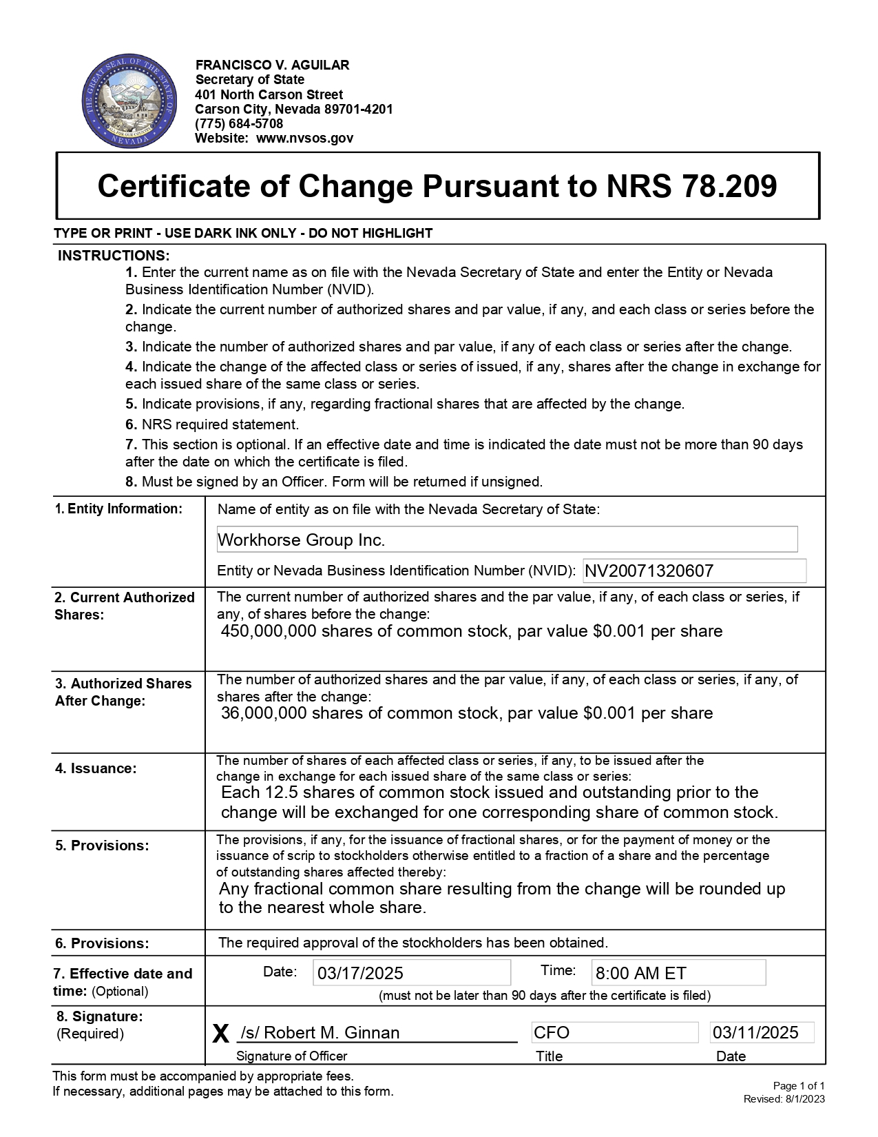 EX-3.1 2 ea023404101ex3-1_work.htm CERTIFICATE OF CHANGE FOR WORKHORSE GROUP INC., EFFECTIVE AS OF MARCH 17, 2025