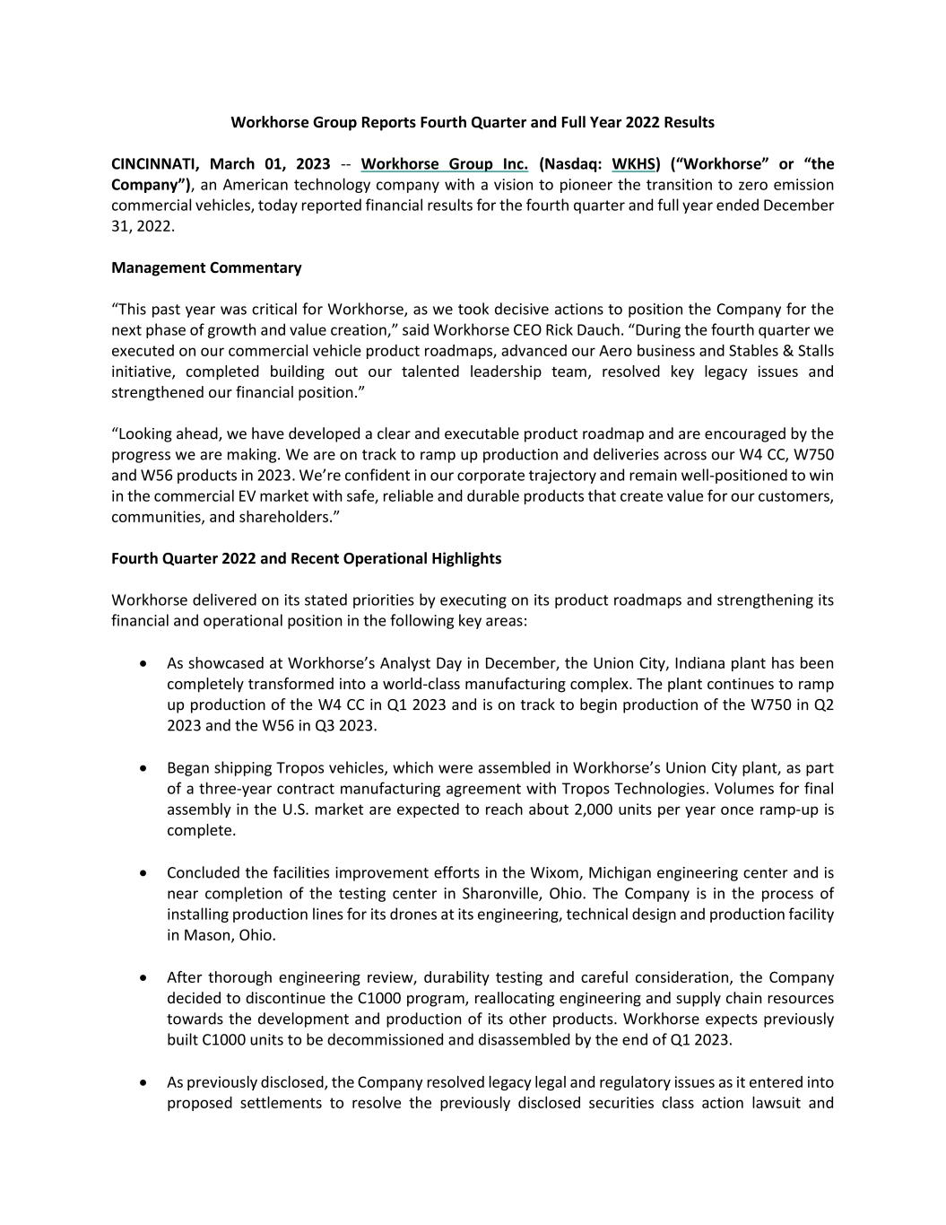 Workhorse Group Reports Fourth Quarter and Full Year 2022 Results CINCINNATI, March 01, 2023 -- Workhorse Group Inc. (Nasdaq: WKHS) (“Workhorse” or “the Company”), an American technology company with a vision to pioneer the transition to zero emission commercial vehicles, today reported financial results for the fourth quarter and full year ended December 31, 2022. Management Commentary “This past year was critical for Workhorse, as we took decisive actions to position the Company for the next phase of growth and value creation,” said Workhorse CEO Rick Dauch. “During the fourth quarter we executed on our commercial vehicle product roadmaps, advanced our Aero business and Stables & Stalls initiative, completed building out our talented leadership team, resolved key legacy issues and strengthened our financial position.” “Looking ahead, we have developed a clear and executable product roadmap and are encouraged by the progress we are making. We are on track to ramp up production and deliveries across our W4 CC, W750 and W56 products in 2023. We’re confident in our corporate trajectory and remain well-positioned to win in the commercial EV market with safe, reliable and durable products that create value for our customers, communities, and shareholders.” Fourth Quarter 2022 and Recent Operational Highlights Workhorse delivered on its stated priorities by executing on its product roadmaps and strengthening its financial and operational position in the following key areas:  As showcased at Workhorse’s Analyst Day in December, the Union City, Indiana plant has been completely transformed into a world-class manufacturing complex. The plant continues to ramp up production of the W4 CC in Q1 2023 and is on track to begin production of the W750 in Q2 2023 and the W56 in Q3 2023.  Began shipping Tropos vehicles, which were assembled in Workhorse’s Union City plant, as part of a three-year contract manufacturing agreement with Tropos Technologies. Volumes for final assembly in the U.S. market are expected to reach about 2,000 units per year once ramp-up is complete.  Concluded the facilities improvement efforts in the Wixom, Michigan engineering center and is near completion of the testing center in Sharonville, Ohio. The Company is in the process of installing production lines for its drones at its engineering, technical design and production facility in Mason, Ohio.  After thorough engineering review, durability testing and careful consideration, the Company decided to discontinue the C1000 program, reallocating engineering and supply chain resources towards the development and production of its other products. Workhorse expects previously built C1000 units to be decommissioned and disassembled by the end of Q1 2023.  As previously disclosed, the Company resolved legacy legal and regulatory issues as it entered into proposed settlements to resolve the previously disclosed securities class action lawsuit and