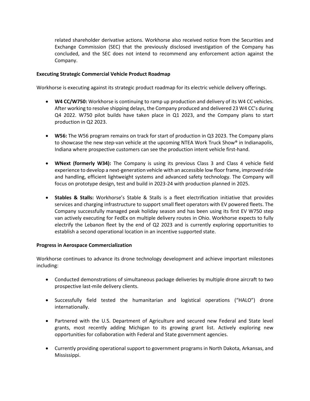 related shareholder derivative actions. Workhorse also received notice from the Securities and Exchange Commission (SEC) that the previously disclosed investigation of the Company has concluded, and the SEC does not intend to recommend any enforcement action against the Company. Executing Strategic Commercial Vehicle Product Roadmap Workhorse is executing against its strategic product roadmap for its electric vehicle delivery offerings.  W4 CC/W750: Workhorse is continuing to ramp up production and delivery of its W4 CC vehicles. After working to resolve shipping delays, the Company produced and delivered 23 W4 CC’s during Q4 2022. W750 pilot builds have taken place in Q1 2023, and the Company plans to start production in Q2 2023.  W56: The W56 program remains on track for start of production in Q3 2023. The Company plans to showcase the new step-van vehicle at the upcoming NTEA Work Truck Show® in Indianapolis, Indiana where prospective customers can see the production intent vehicle first-hand.  WNext (formerly W34): The Company is using its previous Class 3 and Class 4 vehicle field experience to develop a next-generation vehicle with an accessible low floor frame, improved ride and handling, efficient lightweight systems and advanced safety technology. The Company will focus on prototype design, test and build in 2023-24 with production planned in 2025.  Stables & Stalls: Workhorse’s Stable & Stalls is a fleet electrification initiative that provides services and charging infrastructure to support small fleet operators with EV powered fleets. The Company successfully managed peak holiday season and has been using its first EV W750 step van actively executing for FedEx on multiple delivery routes in Ohio. Workhorse expects to fully electrify the Lebanon fleet by the end of Q2 2023 and is currently exploring opportunities to establish a second operational location in an incentive supported state. Progress in Aerospace Commercialization Workhorse continues to advance its drone technology development and achieve important milestones including:  Conducted demonstrations of simultaneous package deliveries by multiple drone aircraft to two prospective last-mile delivery clients.  Successfully field tested the humanitarian and logistical operations (“HALO”) drone internationally.  Partnered with the U.S. Department of Agriculture and secured new Federal and State level grants, most recently adding Michigan to its growing grant list. Actively exploring new opportunities for collaboration with Federal and State government agencies.  Currently providing operational support to government programs in North Dakota, Arkansas, and Mississippi.