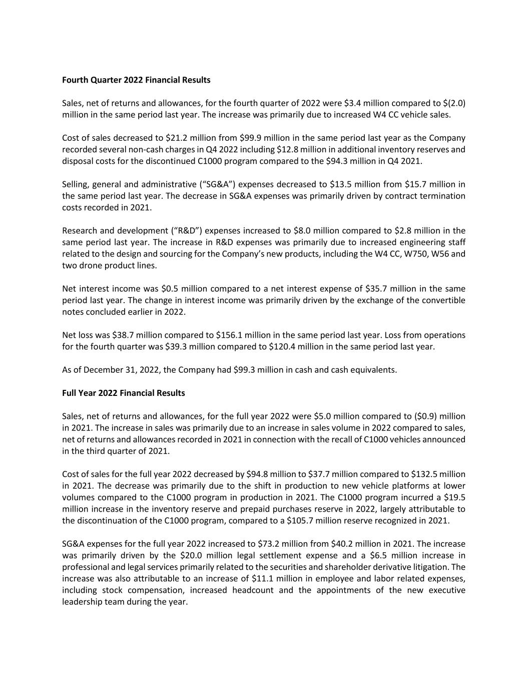 Fourth Quarter 2022 Financial Results Sales, net of returns and allowances, for the fourth quarter of 2022 were $3.4 million compared to $(2.0) million in the same period last year. The increase was primarily due to increased W4 CC vehicle sales. Cost of sales decreased to $21.2 million from $99.9 million in the same period last year as the Company recorded several non-cash charges in Q4 2022 including $12.8 million in additional inventory reserves and disposal costs for the discontinued C1000 program compared to the $94.3 million in Q4 2021. Selling, general and administrative (“SG&A”) expenses decreased to $13.5 million from $15.7 million in the same period last year. The decrease in SG&A expenses was primarily driven by contract termination costs recorded in 2021. Research and development (“R&D”) expenses increased to $8.0 million compared to $2.8 million in the same period last year. The increase in R&D expenses was primarily due to increased engineering staff related to the design and sourcing for the Company’s new products, including the W4 CC, W750, W56 and two drone product lines. Net interest income was $0.5 million compared to a net interest expense of $35.7 million in the same period last year. The change in interest income was primarily driven by the exchange of the convertible notes concluded earlier in 2022. Net loss was $38.7 million compared to $156.1 million in the same period last year. Loss from operations for the fourth quarter was $39.3 million compared to $120.4 million in the same period last year. As of December 31, 2022, the Company had $99.3 million in cash and cash equivalents. Full Year 2022 Financial Results Sales, net of returns and allowances, for the full year 2022 were $5.0 million compared to ($0.9) million in 2021. The increase in sales was primarily due to an increase in sales volume in 2022 compared to sales, net of returns and allowances recorded in 2021 in connection with the recall of C1000 vehicles announced in the third quarter of 2021. Cost of sales for the full year 2022 decreased by $94.8 million to $37.7 million compared to $132.5 million in 2021. The decrease was primarily due to the shift in production to new vehicle platforms at lower volumes compared to the C1000 program in production in 2021. The C1000 program incurred a $19.5 million increase in the inventory reserve and prepaid purchases reserve in 2022, largely attributable to the discontinuation of the C1000 program, compared to a $105.7 million reserve recognized in 2021. SG&A expenses for the full year 2022 increased to $73.2 million from $40.2 million in 2021. The increase was primarily driven by the $20.0 million legal settlement expense and a $6.5 million increase in professional and legal services primarily related to the securities and shareholder derivative litigation. The increase was also attributable to an increase of $11.1 million in employee and labor related expenses, including stock compensation, increased headcount and the appointments of the new executive leadership team during the year.