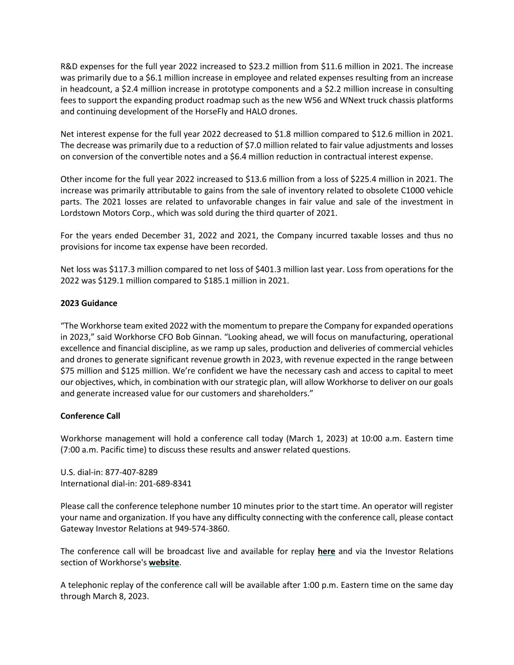 R&D expenses for the full year 2022 increased to $23.2 million from $11.6 million in 2021. The increase was primarily due to a $6.1 million increase in employee and related expenses resulting from an increase in headcount, a $2.4 million increase in prototype components and a $2.2 million increase in consulting fees to support the expanding product roadmap such as the new W56 and WNext truck chassis platforms and continuing development of the HorseFly and HALO drones. Net interest expense for the full year 2022 decreased to $1.8 million compared to $12.6 million in 2021. The decrease was primarily due to a reduction of $7.0 million related to fair value adjustments and losses on conversion of the convertible notes and a $6.4 million reduction in contractual interest expense. Other income for the full year 2022 increased to $13.6 million from a loss of $225.4 million in 2021. The increase was primarily attributable to gains from the sale of inventory related to obsolete C1000 vehicle parts. The 2021 losses are related to unfavorable changes in fair value and sale of the investment in Lordstown Motors Corp., which was sold during the third quarter of 2021. For the years ended December 31, 2022 and 2021, the Company incurred taxable losses and thus no provisions for income tax expense have been recorded. Net loss was $117.3 million compared to net loss of $401.3 million last year. Loss from operations for the 2022 was $129.1 million compared to $185.1 million in 2021. 2023 Guidance “The Workhorse team exited 2022 with the momentum to prepare the Company for expanded operations in 2023,” said Workhorse CFO Bob Ginnan. “Looking ahead, we will focus on manufacturing, operational excellence and financial discipline, as we ramp up sales, production and deliveries of commercial vehicles and drones to generate significant revenue growth in 2023, with revenue expected in the range between $75 million and $125 million. We’re confident we have the necessary cash and access to capital to meet our objectives, which, in combination with our strategic plan, will allow Workhorse to deliver on our goals and generate increased value for our customers and shareholders.” Conference Call Workhorse management will hold a conference call today (March 1, 2023) at 10:00 a.m. Eastern time (7:00 a.m. Pacific time) to discuss these results and answer related questions. U.S. dial-in: 877-407-8289 International dial-in: 201-689-8341 Please call the conference telephone number 10 minutes prior to the start time. An operator will register your name and organization. If you have any difficulty connecting with the conference call, please contact Gateway Investor Relations at 949-574-3860. The conference call will be broadcast live and available for replay here and via the Investor Relations section of Workhorse's website. A telephonic replay of the conference call will be available after 1:00 p.m. Eastern time on the same day through March 8, 2023.