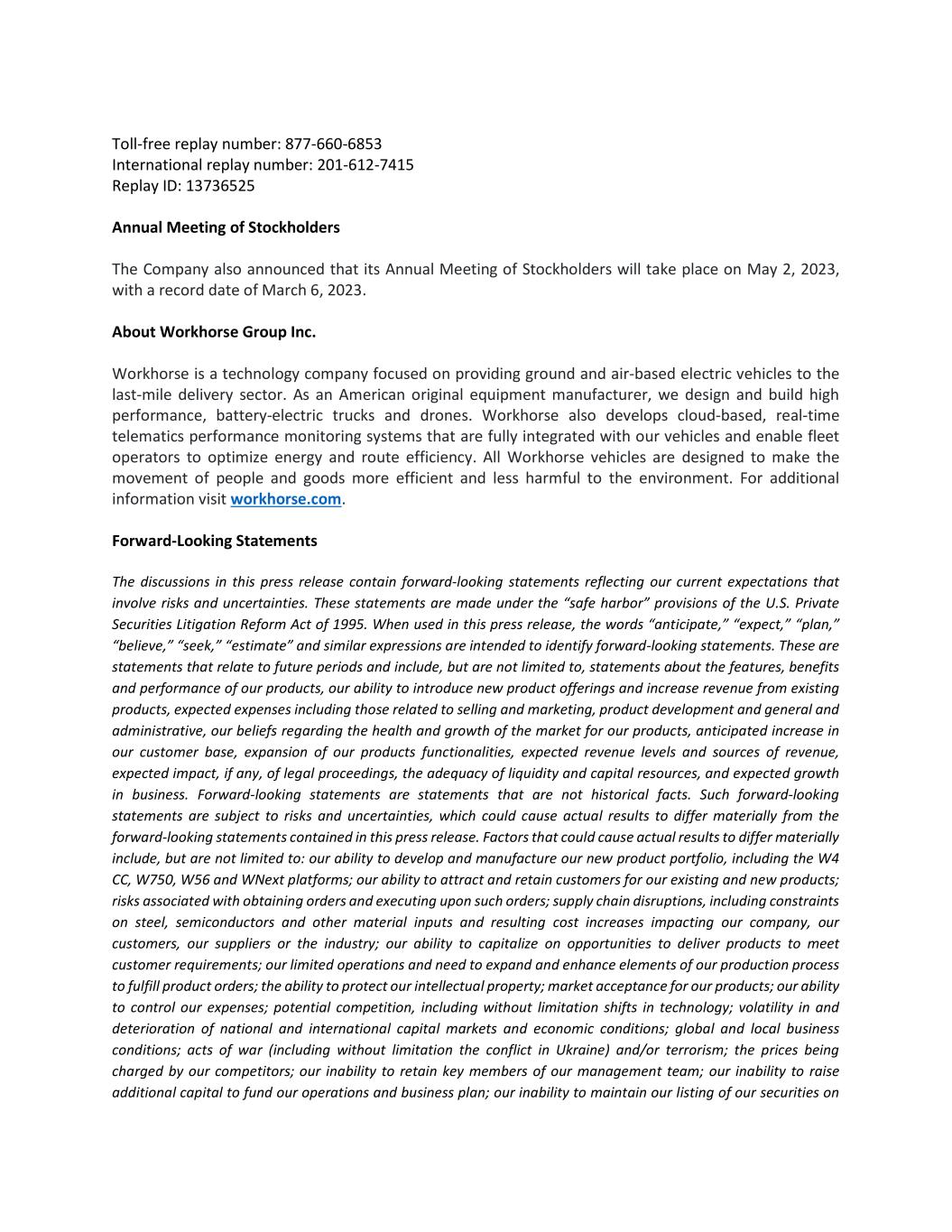 Toll-free replay number: 877-660-6853 International replay number: 201-612-7415 Replay ID: 13736525 Annual Meeting of Stockholders The Company also announced that its Annual Meeting of Stockholders will take place on May 2, 2023, with a record date of March 6, 2023. About Workhorse Group Inc. Workhorse is a technology company focused on providing ground and air-based electric vehicles to the last-mile delivery sector. As an American original equipment manufacturer, we design and build high performance, battery-electric trucks and drones. Workhorse also develops cloud-based, real-time telematics performance monitoring systems that are fully integrated with our vehicles and enable fleet operators to optimize energy and route efficiency. All Workhorse vehicles are designed to make the movement of people and goods more efficient and less harmful to the environment. For additional information visit workhorse.com. Forward-Looking Statements The discussions in this press release contain forward-looking statements reflecting our current expectations that involve risks and uncertainties. These statements are made under the “safe harbor” provisions of the U.S. Private Securities Litigation Reform Act of 1995. When used in this press release, the words “anticipate,” “expect,” “plan,” “believe,” “seek,” “estimate” and similar expressions are intended to identify forward-looking statements. These are statements that relate to future periods and include, but are not limited to, statements about the features, benefits and performance of our products, our ability to introduce new product offerings and increase revenue from existing products, expected expenses including those related to selling and marketing, product development and general and administrative, our beliefs regarding the health and growth of the market for our products, anticipated increase in our customer base, expansion of our products functionalities, expected revenue levels and sources of revenue, expected impact, if any, of legal proceedings, the adequacy of liquidity and capital resources, and expected growth in business. Forward-looking statements are statements that are not historical facts. Such forward-looking statements are subject to risks and uncertainties, which could cause actual results to differ materially from the forward-looking statements contained in this press release. Factors that could cause actual results to differ materially include, but are not limited to: our ability to develop and manufacture our new product portfolio, including the W4 CC, W750, W56 and WNext platforms; our ability to attract and retain customers for our existing and new products; risks associated with obtaining orders and executing upon such orders; supply chain disruptions, including constraints on steel, semiconductors and other material inputs and resulting cost increases impacting our company, our customers, our suppliers or the industry; our ability to capitalize on opportunities to deliver products to meet customer requirements; our limited operations and need to expand and enhance elements of our production process to fulfill product orders; the ability to protect our intellectual property; market acceptance for our products; our ability to control our expenses; potential competition, including without limitation shifts in technology; volatility in and deterioration of national and international capital markets and economic conditions; global and local business conditions; acts of war (including without limitation the conflict in Ukraine) and/or terrorism; the prices being charged by our competitors; our inability to retain key members of our management team; our inability to raise additional capital to fund our operations and business plan; our inability to maintain our listing of our securities on