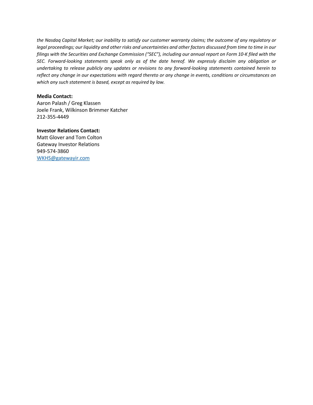 the Nasdaq Capital Market; our inability to satisfy our customer warranty claims; the outcome of any regulatory or legal proceedings; our liquidity and other risks and uncertainties and other factors discussed from time to time in our filings with the Securities and Exchange Commission (“SEC”), including our annual report on Form 10-K filed with the SEC. Forward-looking statements speak only as of the date hereof. We expressly disclaim any obligation or undertaking to release publicly any updates or revisions to any forward-looking statements contained herein to reflect any change in our expectations with regard thereto or any change in events, conditions or circumstances on which any such statement is based, except as required by law. Media Contact: Aaron Palash / Greg Klassen Joele Frank, Wilkinson Brimmer Katcher 212-355-4449 Investor Relations Contact: Matt Glover and Tom Colton Gateway Investor Relations 949-574-3860 WKHS@gatewayir.com