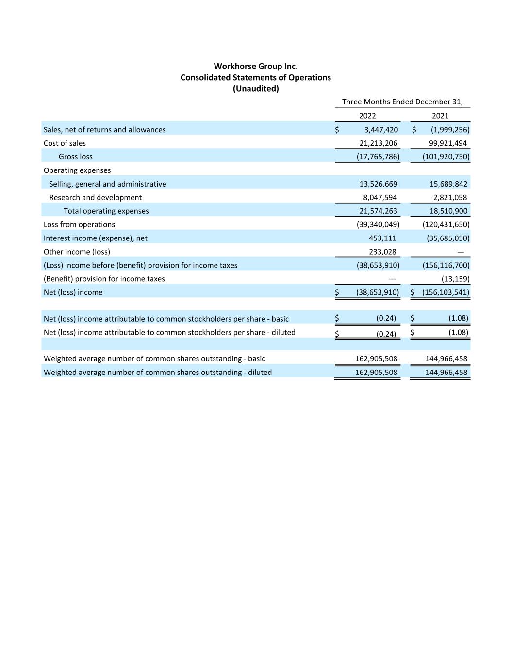 Workhorse Group Inc. Consolidated Statements of Operations (Unaudited) Three Months Ended December 31, 2022 2021 Sales, net of returns and allowances $ 3,447,420 $ (1,999,256) Cost of sales 21,213,206 99,921,494 Gross loss (17,765,786) (101,920,750) Operating expenses Selling, general and administrative 13,526,669 15,689,842 Research and development 8,047,594 2,821,058 Total operating expenses 21,574,263 18,510,900 Loss from operations (39,340,049) (120,431,650) Interest income (expense), net 453,111 (35,685,050) Other income (loss) 233,028 — (Loss) income before (benefit) provision for income taxes (38,653,910) (156,116,700) (Benefit) provision for income taxes — (13,159) Net (loss) income $ (38,653,910) $ (156,103,541) Net (loss) income attributable to common stockholders per share - basic $ (0.24) $ (1.08) Net (loss) income attributable to common stockholders per share - diluted $ (0.24) $ (1.08) Weighted average number of common shares outstanding - basic 162,905,508 144,966,458 Weighted average number of common shares outstanding - diluted 162,905,508 144,966,458