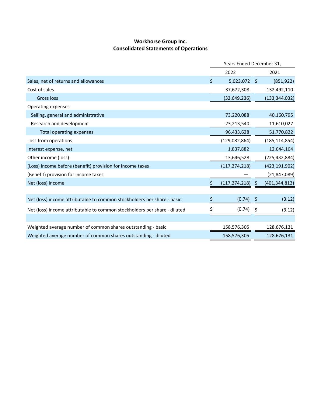 Workhorse Group Inc. Consolidated Statements of Operations Years Ended December 31, 2022 2021 Sales, net of returns and allowances $ 5,023,072 $ (851,922) Cost of sales 37,672,308 132,492,110 Gross loss (32,649,236) (133,344,032) Operating expenses Selling, general and administrative 73,220,088 40,160,795 Research and development 23,213,540 11,610,027 Total operating expenses 96,433,628 51,770,822 Loss from operations (129,082,864) (185,114,854) Interest expense, net 1,837,882 12,644,164 Other income (loss) 13,646,528 (225,432,884) (Loss) income before (benefit) provision for income taxes (117,274,218) (423,191,902) (Benefit) provision for income taxes — (21,847,089) Net (loss) income $ (117,274,218) $ (401,344,813) Net (loss) income attributable to common stockholders per share - basic $ (0.74) $ (3.12) Net (loss) income attributable to common stockholders per share - diluted $ (0.74) $ (3.12) Weighted average number of common shares outstanding - basic 158,576,305 128,676,131 Weighted average number of common shares outstanding - diluted 158,576,305 128,676,131