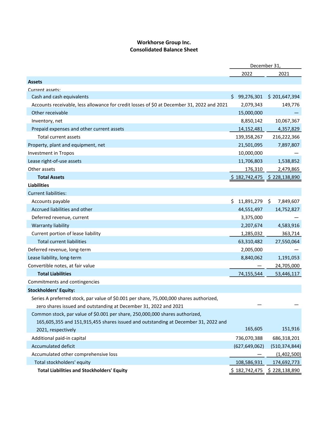Workhorse Group Inc. Consolidated Balance Sheet December 31, 2022 2021 Assets Current assets: Cash and cash equivalents $ 99,276,301 $ 201,647,394 Accounts receivable, less allowance for credit losses of $0 at December 31, 2022 and 2021 2,079,343 149,776 Other receivable 15,000,000 — Inventory, net 8,850,142 10,067,367 Prepaid expenses and other current assets 14,152,481 4,357,829 Total current assets 139,358,267 216,222,366 Property, plant and equipment, net 21,501,095 7,897,807 Investment in Tropos 10,000,000 — Lease right-of-use assets 11,706,803 1,538,852 Other assets 176,310 2,479,865 Total Assets $ 182,742,475 $ 228,138,890 Liabilities Current liabilities: Accounts payable $ 11,891,279 $ 7,849,607 Accrued liabilities and other 44,551,497 14,752,827 Deferred revenue, current 3,375,000 — Warranty liability 2,207,674 4,583,916 Current portion of lease liability 1,285,032 363,714 Total current liabilities 63,310,482 27,550,064 Deferred revenue, long-term 2,005,000 — Lease liability, long-term 8,840,062 1,191,053 Convertible notes, at fair value — 24,705,000 Total Liabilities 74,155,544 53,446,117 Commitments and contingencies Stockholders’ Equity: Series A preferred stock, par value of $0.001 per share, 75,000,000 shares authorized, zero shares issued and outstanding at December 31, 2022 and 2021 — — Common stock, par value of $0.001 per share, 250,000,000 shares authorized, 165,605,355 and 151,915,455 shares issued and outstanding at December 31, 2022 and 2021, respectively 165,605 151,916 Additional paid-in capital 736,070,388 686,318,201 Accumulated deficit (627,649,062) (510,374,844) Accumulated other comprehensive loss — (1,402,500) Total stockholders' equity 108,586,931 174,692,773 Total Liabilities and Stockholders' Equity $ 182,742,475 $ 228,138,890