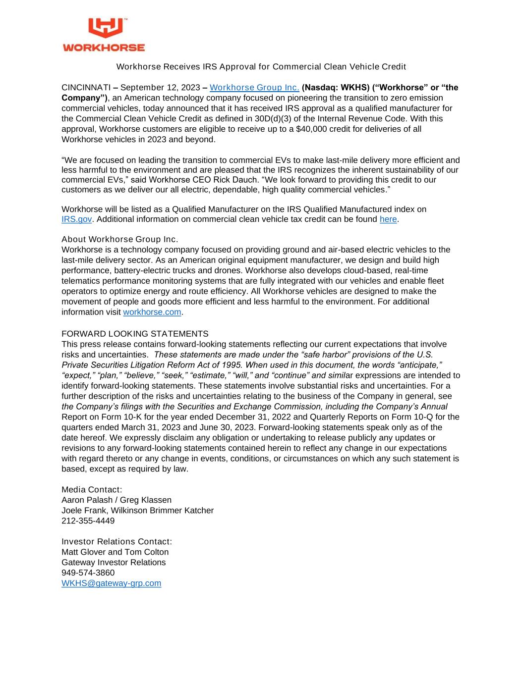 Workhorse Receives IRS Approval for Commercial Clean Vehicle Credit CINCINNATI – September 12, 2023 – Workhorse Group Inc. (Nasdaq: WKHS) (“Workhorse” or “the Company”), an American technology company focused on pioneering the transition to zero emission commercial vehicles, today announced that it has received IRS approval as a qualified manufacturer for the Commercial Clean Vehicle Credit as defined in 30D(d)(3) of the Internal Revenue Code. With this approval, Workhorse customers are eligible to receive up to a $40,000 credit for deliveries of all Workhorse vehicles in 2023 and beyond. “We are focused on leading the transition to commercial EVs to make last-mile delivery more efficient and less harmful to the environment and are pleased that the IRS recognizes the inherent sustainability of our commercial EVs,” said Workhorse CEO Rick Dauch. “We look forward to providing this credit to our customers as we deliver our all electric, dependable, high quality commercial vehicles.” Workhorse will be listed as a Qualified Manufacturer on the IRS Qualified Manufactured index on IRS.gov. Additional information on commercial clean vehicle tax credit can be found here. About Workhorse Group Inc. Workhorse is a technology company focused on providing ground and air-based electric vehicles to the last-mile delivery sector. As an American original equipment manufacturer, we design and build high performance, battery-electric trucks and drones. Workhorse also develops cloud-based, real-time telematics performance monitoring systems that are fully integrated with our vehicles and enable fleet operators to optimize energy and route efficiency. All Workhorse vehicles are designed to make the movement of people and goods more efficient and less harmful to the environment. For additional information visit workhorse.com. FORWARD LOOKING STATEMENTS This press release contains forward-looking statements reflecting our current expectations that involve risks and uncertainties. These statements are made under the “safe harbor” provisions of the U.S. Private Securities Litigation Reform Act of 1995. When used in this document, the words “anticipate,” “expect,” “plan,” “believe,” “seek,” “estimate,” “will,” and “continue” and similar expressions are intended to identify forward-looking statements. These statements involve substantial risks and uncertainties. For a further description of the risks and uncertainties relating to the business of the Company in general, see the Company’s filings with the Securities and Exchange Commission, including the Company’s Annual Report on Form 10-K for the year ended December 31, 2022 and Quarterly Reports on Form 10-Q for the quarters ended March 31, 2023 and June 30, 2023. Forward-looking statements speak only as of the date hereof. We expressly disclaim any obligation or undertaking to release publicly any updates or revisions to any forward-looking statements contained herein to reflect any change in our expectations with regard thereto or any change in events, conditions, or circumstances on which any such statement is based, except as required by law. Media Contact: Aaron Palash / Greg Klassen Joele Frank, Wilkinson Brimmer Katcher 212-355-4449 Investor Relations Contact: Matt Glover and Tom Colton Gateway Investor Relations 949-574-3860 WKHS@gateway-grp.com