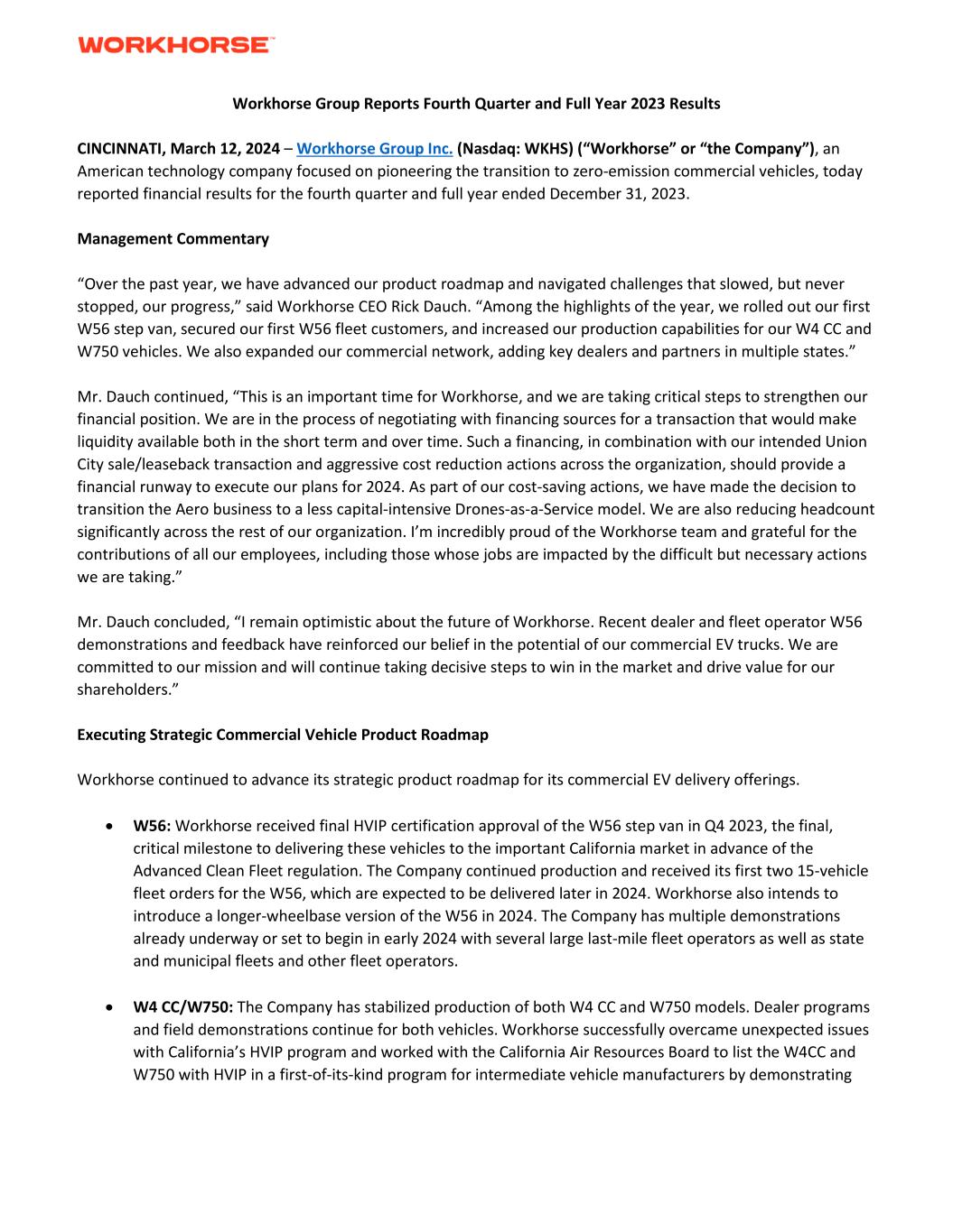 Workhorse Group Reports Fourth Quarter and Full Year 2023 Results CINCINNATI, March 12, 2024 – Workhorse Group Inc. (Nasdaq: WKHS) (“Workhorse” or “the Company”), an American technology company focused on pioneering the transition to zero-emission commercial vehicles, today reported financial results for the fourth quarter and full year ended December 31, 2023. Management Commentary “Over the past year, we have advanced our product roadmap and navigated challenges that slowed, but never stopped, our progress,” said Workhorse CEO Rick Dauch. “Among the highlights of the year, we rolled out our first W56 step van, secured our first W56 fleet customers, and increased our production capabilities for our W4 CC and W750 vehicles. We also expanded our commercial network, adding key dealers and partners in multiple states.” Mr. Dauch continued, “This is an important time for Workhorse, and we are taking critical steps to strengthen our financial position. We are in the process of negotiating with financing sources for a transaction that would make liquidity available both in the short term and over time. Such a financing, in combination with our intended Union City sale/leaseback transaction and aggressive cost reduction actions across the organization, should provide a financial runway to execute our plans for 2024. As part of our cost-saving actions, we have made the decision to transition the Aero business to a less capital-intensive Drones-as-a-Service model. We are also reducing headcount significantly across the rest of our organization. I’m incredibly proud of the Workhorse team and grateful for the contributions of all our employees, including those whose jobs are impacted by the difficult but necessary actions we are taking.” Mr. Dauch concluded, “I remain optimistic about the future of Workhorse. Recent dealer and fleet operator W56 demonstrations and feedback have reinforced our belief in the potential of our commercial EV trucks. We are committed to our mission and will continue taking decisive steps to win in the market and drive value for our shareholders.” Executing Strategic Commercial Vehicle Product Roadmap Workhorse continued to advance its strategic product roadmap for its commercial EV delivery offerings. • W56: Workhorse received final HVIP certification approval of the W56 step van in Q4 2023, the final, critical milestone to delivering these vehicles to the important California market in advance of the Advanced Clean Fleet regulation. The Company continued production and received its first two 15-vehicle fleet orders for the W56, which are expected to be delivered later in 2024. Workhorse also intends to introduce a longer-wheelbase version of the W56 in 2024. The Company has multiple demonstrations already underway or set to begin in early 2024 with several large last-mile fleet operators as well as state and municipal fleets and other fleet operators. • W4 CC/W750: The Company has stabilized production of both W4 CC and W750 models. Dealer programs and field demonstrations continue for both vehicles. Workhorse successfully overcame unexpected issues with California’s HVIP program and worked with the California Air Resources Board to list the W4CC and W750 with HVIP in a first-of-its-kind program for intermediate vehicle manufacturers by demonstrating