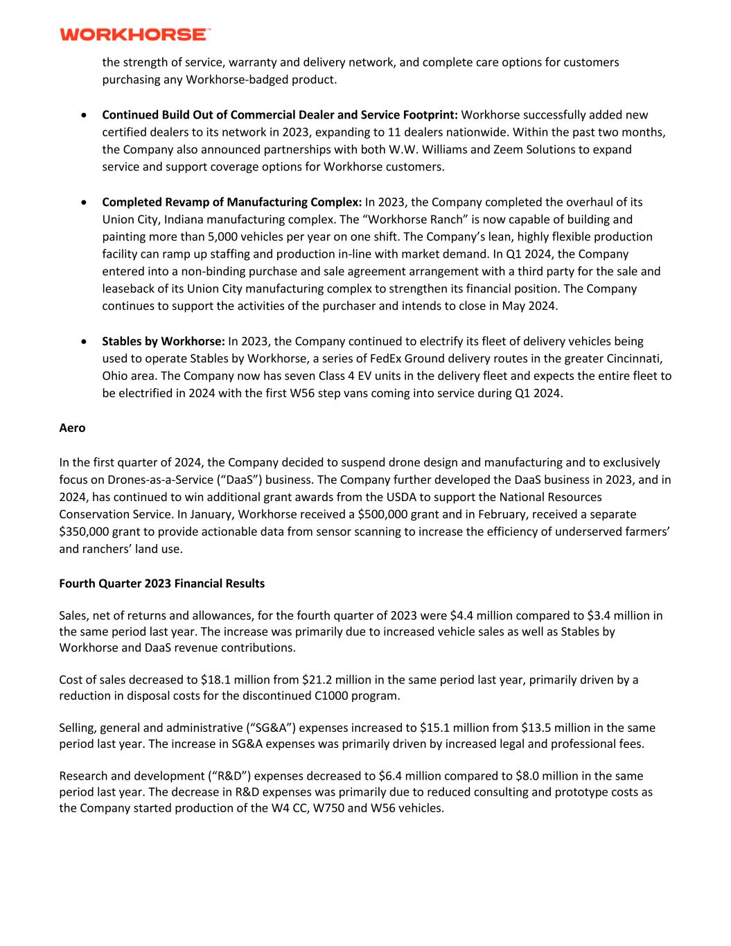 the strength of service, warranty and delivery network, and complete care options for customers purchasing any Workhorse-badged product. • Continued Build Out of Commercial Dealer and Service Footprint: Workhorse successfully added new certified dealers to its network in 2023, expanding to 11 dealers nationwide. Within the past two months, the Company also announced partnerships with both W.W. Williams and Zeem Solutions to expand service and support coverage options for Workhorse customers. • Completed Revamp of Manufacturing Complex: In 2023, the Company completed the overhaul of its Union City, Indiana manufacturing complex. The “Workhorse Ranch” is now capable of building and painting more than 5,000 vehicles per year on one shift. The Company’s lean, highly flexible production facility can ramp up staffing and production in-line with market demand. In Q1 2024, the Company entered into a non-binding purchase and sale agreement arrangement with a third party for the sale and leaseback of its Union City manufacturing complex to strengthen its financial position. The Company continues to support the activities of the purchaser and intends to close in May 2024. • Stables by Workhorse: In 2023, the Company continued to electrify its fleet of delivery vehicles being used to operate Stables by Workhorse, a series of FedEx Ground delivery routes in the greater Cincinnati, Ohio area. The Company now has seven Class 4 EV units in the delivery fleet and expects the entire fleet to be electrified in 2024 with the first W56 step vans coming into service during Q1 2024. Aero In the first quarter of 2024, the Company decided to suspend drone design and manufacturing and to exclusively focus on Drones-as-a-Service (“DaaS”) business. The Company further developed the DaaS business in 2023, and in 2024, has continued to win additional grant awards from the USDA to support the National Resources Conservation Service. In January, Workhorse received a $500,000 grant and in February, received a separate $350,000 grant to provide actionable data from sensor scanning to increase the efficiency of underserved farmers’ and ranchers’ land use. Fourth Quarter 2023 Financial Results Sales, net of returns and allowances, for the fourth quarter of 2023 were $4.4 million compared to $3.4 million in the same period last year. The increase was primarily due to increased vehicle sales as well as Stables by Workhorse and DaaS revenue contributions. Cost of sales decreased to $18.1 million from $21.2 million in the same period last year, primarily driven by a reduction in disposal costs for the discontinued C1000 program. Selling, general and administrative (“SG&A”) expenses increased to $15.1 million from $13.5 million in the same period last year. The increase in SG&A expenses was primarily driven by increased legal and professional fees. Research and development (“R&D”) expenses decreased to $6.4 million compared to $8.0 million in the same period last year. The decrease in R&D expenses was primarily due to reduced consulting and prototype costs as the Company started production of the W4 CC, W750 and W56 vehicles.