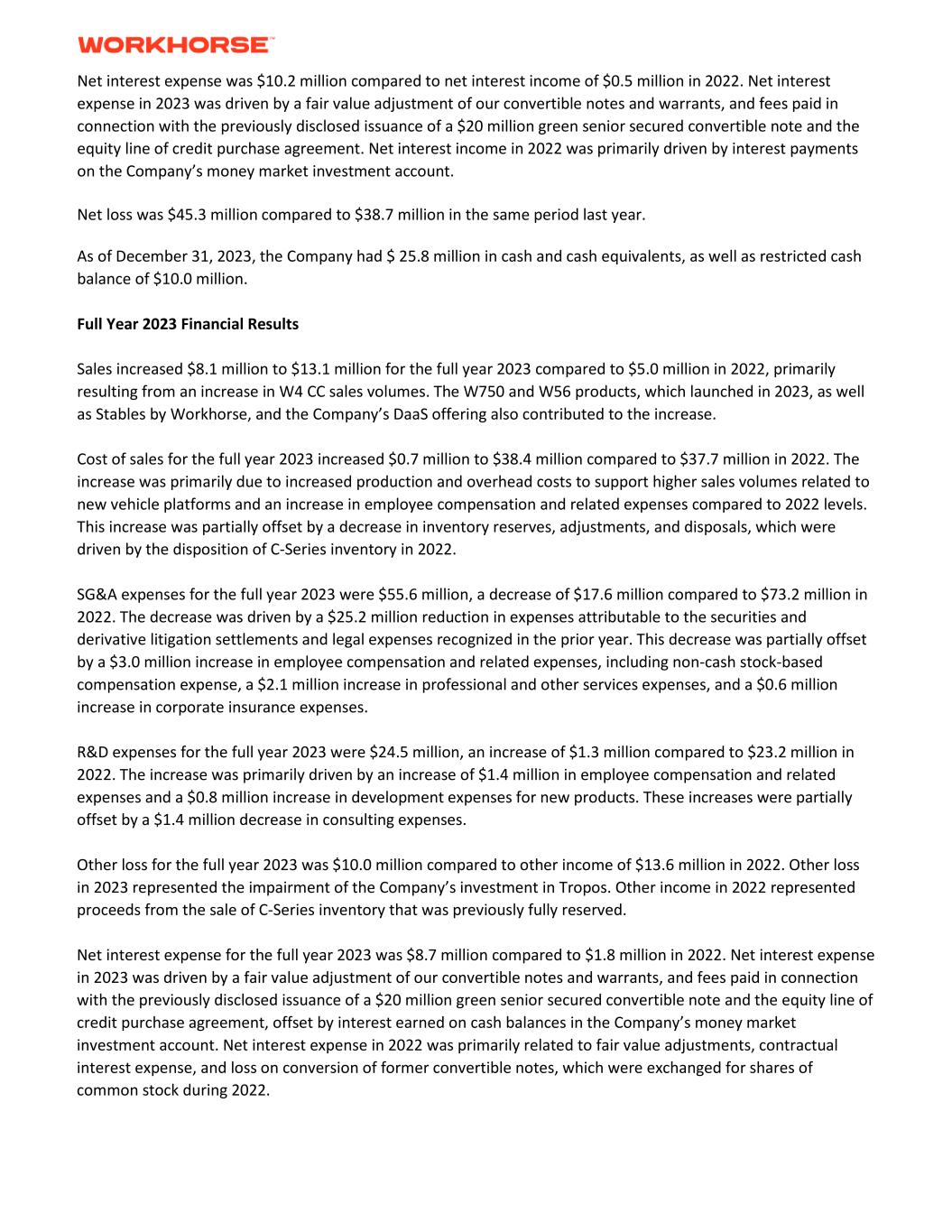 Net interest expense was $10.2 million compared to net interest income of $0.5 million in 2022. Net interest expense in 2023 was driven by a fair value adjustment of our convertible notes and warrants, and fees paid in connection with the previously disclosed issuance of a $20 million green senior secured convertible note and the equity line of credit purchase agreement. Net interest income in 2022 was primarily driven by interest payments on the Company’s money market investment account. Net loss was $45.3 million compared to $38.7 million in the same period last year. As of December 31, 2023, the Company had $ 25.8 million in cash and cash equivalents, as well as restricted cash balance of $10.0 million. Full Year 2023 Financial Results Sales increased $8.1 million to $13.1 million for the full year 2023 compared to $5.0 million in 2022, primarily resulting from an increase in W4 CC sales volumes. The W750 and W56 products, which launched in 2023, as well as Stables by Workhorse, and the Company’s DaaS offering also contributed to the increase. Cost of sales for the full year 2023 increased $0.7 million to $38.4 million compared to $37.7 million in 2022. The increase was primarily due to increased production and overhead costs to support higher sales volumes related to new vehicle platforms and an increase in employee compensation and related expenses compared to 2022 levels. This increase was partially offset by a decrease in inventory reserves, adjustments, and disposals, which were driven by the disposition of C-Series inventory in 2022. SG&A expenses for the full year 2023 were $55.6 million, a decrease of $17.6 million compared to $73.2 million in 2022. The decrease was driven by a $25.2 million reduction in expenses attributable to the securities and derivative litigation settlements and legal expenses recognized in the prior year. This decrease was partially offset by a $3.0 million increase in employee compensation and related expenses, including non-cash stock-based compensation expense, a $2.1 million increase in professional and other services expenses, and a $0.6 million increase in corporate insurance expenses. R&D expenses for the full year 2023 were $24.5 million, an increase of $1.3 million compared to $23.2 million in 2022. The increase was primarily driven by an increase of $1.4 million in employee compensation and related expenses and a $0.8 million increase in development expenses for new products. These increases were partially offset by a $1.4 million decrease in consulting expenses. Other loss for the full year 2023 was $10.0 million compared to other income of $13.6 million in 2022. Other loss in 2023 represented the impairment of the Company’s investment in Tropos. Other income in 2022 represented proceeds from the sale of C-Series inventory that was previously fully reserved. Net interest expense for the full year 2023 was $8.7 million compared to $1.8 million in 2022. Net interest expense in 2023 was driven by a fair value adjustment of our convertible notes and warrants, and fees paid in connection with the previously disclosed issuance of a $20 million green senior secured convertible note and the equity line of credit purchase agreement, offset by interest earned on cash balances in the Company’s money market investment account. Net interest expense in 2022 was primarily related to fair value adjustments, contractual interest expense, and loss on conversion of former convertible notes, which were exchanged for shares of common stock during 2022.