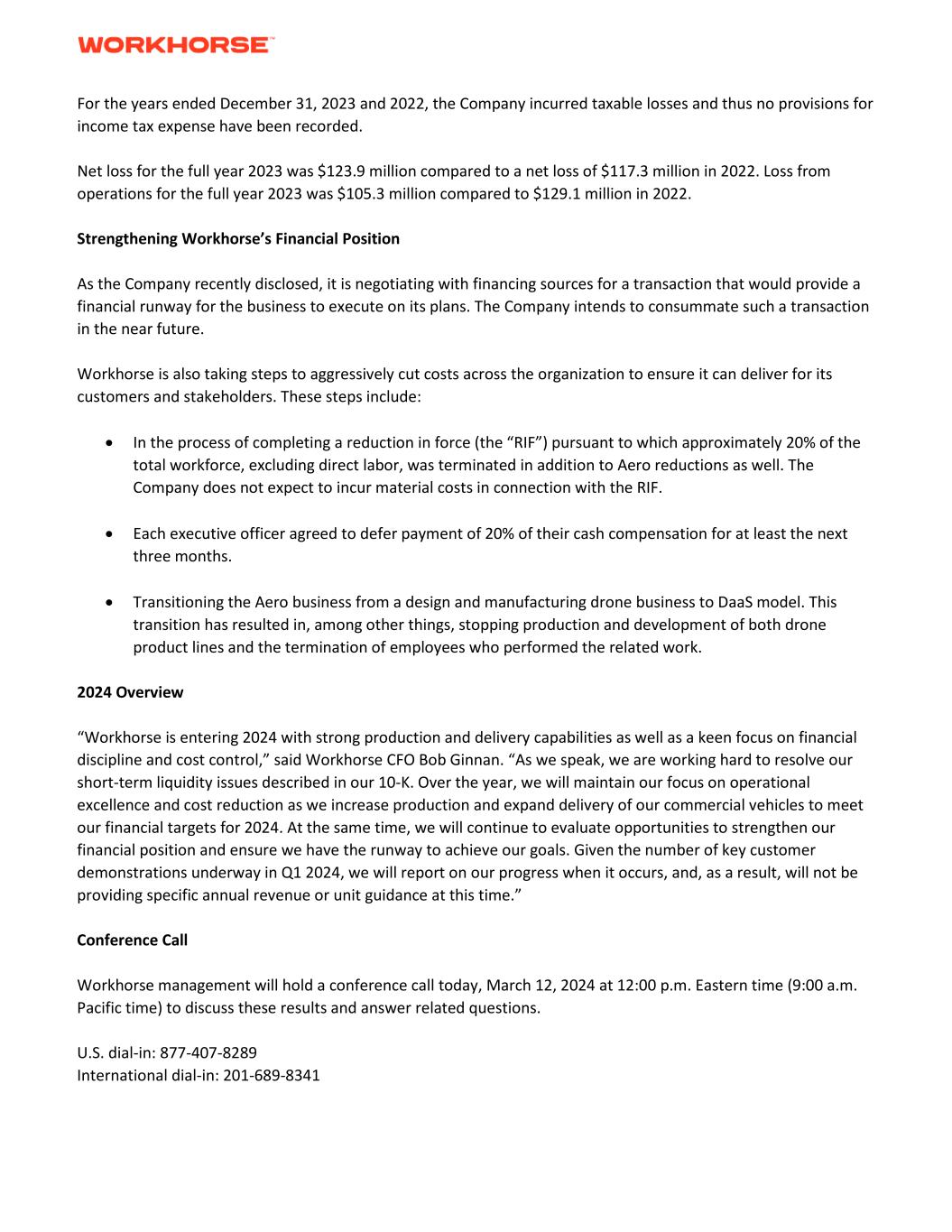 For the years ended December 31, 2023 and 2022, the Company incurred taxable losses and thus no provisions for income tax expense have been recorded. Net loss for the full year 2023 was $123.9 million compared to a net loss of $117.3 million in 2022. Loss from operations for the full year 2023 was $105.3 million compared to $129.1 million in 2022. Strengthening Workhorse’s Financial Position As the Company recently disclosed, it is negotiating with financing sources for a transaction that would provide a financial runway for the business to execute on its plans. The Company intends to consummate such a transaction in the near future. Workhorse is also taking steps to aggressively cut costs across the organization to ensure it can deliver for its customers and stakeholders. These steps include: • In the process of completing a reduction in force (the “RIF”) pursuant to which approximately 20% of the total workforce, excluding direct labor, was terminated in addition to Aero reductions as well. The Company does not expect to incur material costs in connection with the RIF. • Each executive officer agreed to defer payment of 20% of their cash compensation for at least the next three months. • Transitioning the Aero business from a design and manufacturing drone business to DaaS model. This transition has resulted in, among other things, stopping production and development of both drone product lines and the termination of employees who performed the related work. 2024 Overview “Workhorse is entering 2024 with strong production and delivery capabilities as well as a keen focus on financial discipline and cost control,” said Workhorse CFO Bob Ginnan. “As we speak, we are working hard to resolve our short-term liquidity issues described in our 10-K. Over the year, we will maintain our focus on operational excellence and cost reduction as we increase production and expand delivery of our commercial vehicles to meet our financial targets for 2024. At the same time, we will continue to evaluate opportunities to strengthen our financial position and ensure we have the runway to achieve our goals. Given the number of key customer demonstrations underway in Q1 2024, we will report on our progress when it occurs, and, as a result, will not be providing specific annual revenue or unit guidance at this time.” Conference Call Workhorse management will hold a conference call today, March 12, 2024 at 12:00 p.m. Eastern time (9:00 a.m. Pacific time) to discuss these results and answer related questions. U.S. dial-in: 877-407-8289 International dial-in: 201-689-8341