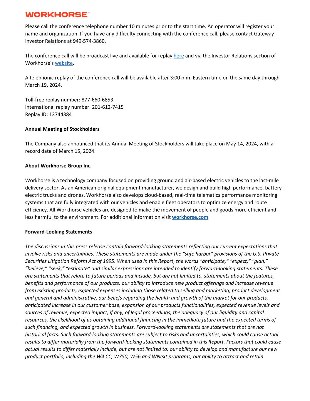 Please call the conference telephone number 10 minutes prior to the start time. An operator will register your name and organization. If you have any difficulty connecting with the conference call, please contact Gateway Investor Relations at 949-574-3860. The conference call will be broadcast live and available for replay here and via the Investor Relations section of Workhorse's website. A telephonic replay of the conference call will be available after 3:00 p.m. Eastern time on the same day through March 19, 2024. Toll-free replay number: 877-660-6853 International replay number: 201-612-7415 Replay ID: 13744384 Annual Meeting of Stockholders The Company also announced that its Annual Meeting of Stockholders will take place on May 14, 2024, with a record date of March 15, 2024. About Workhorse Group Inc. Workhorse is a technology company focused on providing ground and air-based electric vehicles to the last-mile delivery sector. As an American original equipment manufacturer, we design and build high performance, battery- electric trucks and drones. Workhorse also develops cloud-based, real-time telematics performance monitoring systems that are fully integrated with our vehicles and enable fleet operators to optimize energy and route efficiency. All Workhorse vehicles are designed to make the movement of people and goods more efficient and less harmful to the environment. For additional information visit workhorse.com. Forward-Looking Statements The discussions in this press release contain forward-looking statements reflecting our current expectations that involve risks and uncertainties. These statements are made under the “safe harbor” provisions of the U.S. Private Securities Litigation Reform Act of 1995. When used in this Report, the words “anticipate,” “expect,” “plan,” “believe,” “seek,” “estimate” and similar expressions are intended to identify forward-looking statements. These are statements that relate to future periods and include, but are not limited to, statements about the features, benefits and performance of our products, our ability to introduce new product offerings and increase revenue from existing products, expected expenses including those related to selling and marketing, product development and general and administrative, our beliefs regarding the health and growth of the market for our products, anticipated increase in our customer base, expansion of our products functionalities, expected revenue levels and sources of revenue, expected impact, if any, of legal proceedings, the adequacy of our liquidity and capital resources, the likelihood of us obtaining additional financing in the immediate future and the expected terms of such financing, and expected growth in business. Forward-looking statements are statements that are not historical facts. Such forward-looking statements are subject to risks and uncertainties, which could cause actual results to differ materially from the forward-looking statements contained in this Report. Factors that could cause actual results to differ materially include, but are not limited to: our ability to develop and manufacture our new product portfolio, including the W4 CC, W750, W56 and WNext programs; our ability to attract and retain
