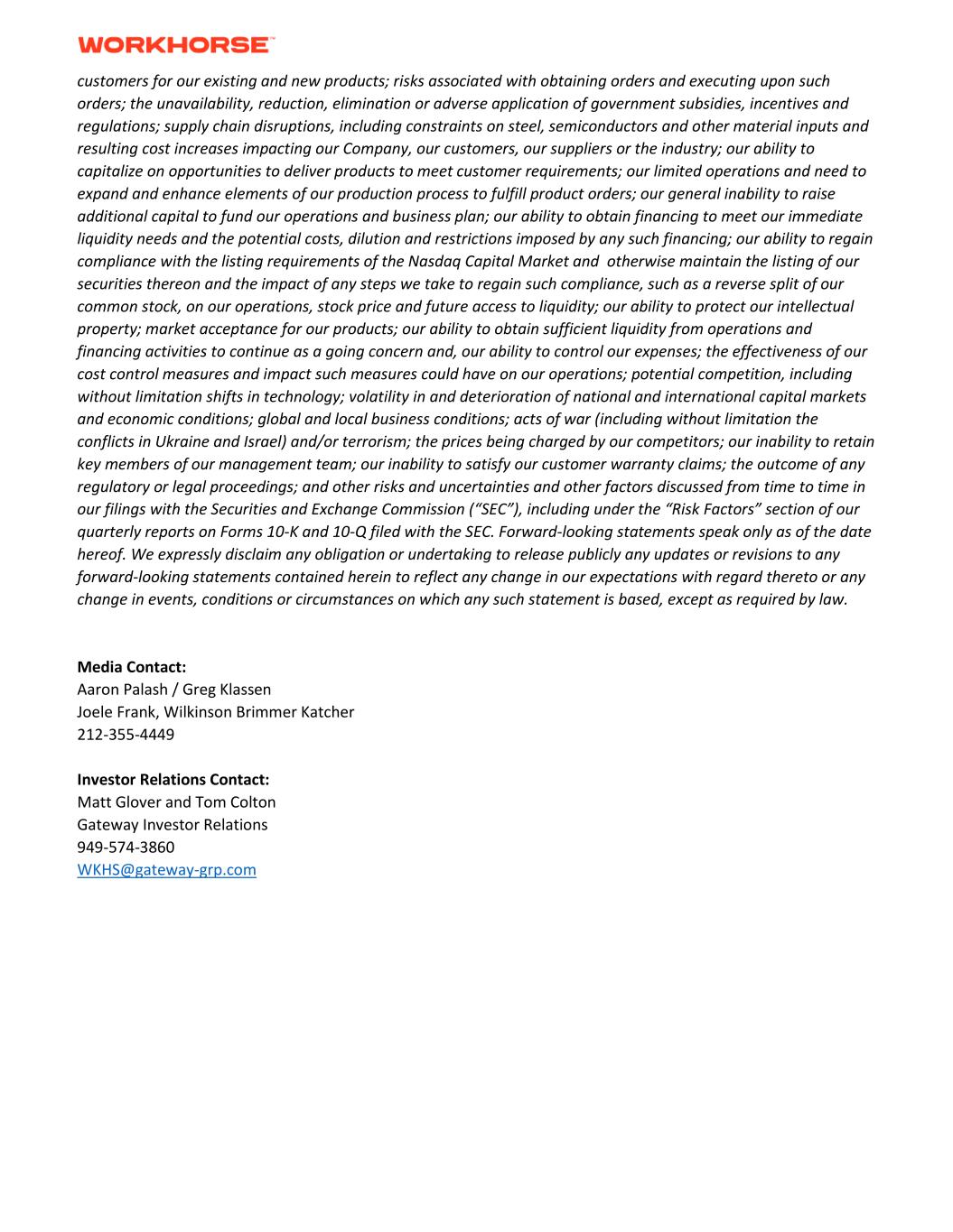 customers for our existing and new products; risks associated with obtaining orders and executing upon such orders; the unavailability, reduction, elimination or adverse application of government subsidies, incentives and regulations; supply chain disruptions, including constraints on steel, semiconductors and other material inputs and resulting cost increases impacting our Company, our customers, our suppliers or the industry; our ability to capitalize on opportunities to deliver products to meet customer requirements; our limited operations and need to expand and enhance elements of our production process to fulfill product orders; our general inability to raise additional capital to fund our operations and business plan; our ability to obtain financing to meet our immediate liquidity needs and the potential costs, dilution and restrictions imposed by any such financing; our ability to regain compliance with the listing requirements of the Nasdaq Capital Market and otherwise maintain the listing of our securities thereon and the impact of any steps we take to regain such compliance, such as a reverse split of our common stock, on our operations, stock price and future access to liquidity; our ability to protect our intellectual property; market acceptance for our products; our ability to obtain sufficient liquidity from operations and financing activities to continue as a going concern and, our ability to control our expenses; the effectiveness of our cost control measures and impact such measures could have on our operations; potential competition, including without limitation shifts in technology; volatility in and deterioration of national and international capital markets and economic conditions; global and local business conditions; acts of war (including without limitation the conflicts in Ukraine and Israel) and/or terrorism; the prices being charged by our competitors; our inability to retain key members of our management team; our inability to satisfy our customer warranty claims; the outcome of any regulatory or legal proceedings; and other risks and uncertainties and other factors discussed from time to time in our filings with the Securities and Exchange Commission (“SEC”), including under the “Risk Factors” section of our quarterly reports on Forms 10-K and 10-Q filed with the SEC. Forward-looking statements speak only as of the date hereof. We expressly disclaim any obligation or undertaking to release publicly any updates or revisions to any forward-looking statements contained herein to reflect any change in our expectations with regard thereto or any change in events, conditions or circumstances on which any such statement is based, except as required by law. Media Contact: Aaron Palash / Greg Klassen Joele Frank, Wilkinson Brimmer Katcher 212-355-4449 Investor Relations Contact: Matt Glover and Tom Colton Gateway Investor Relations 949-574-3860 WKHS@gateway-grp.com