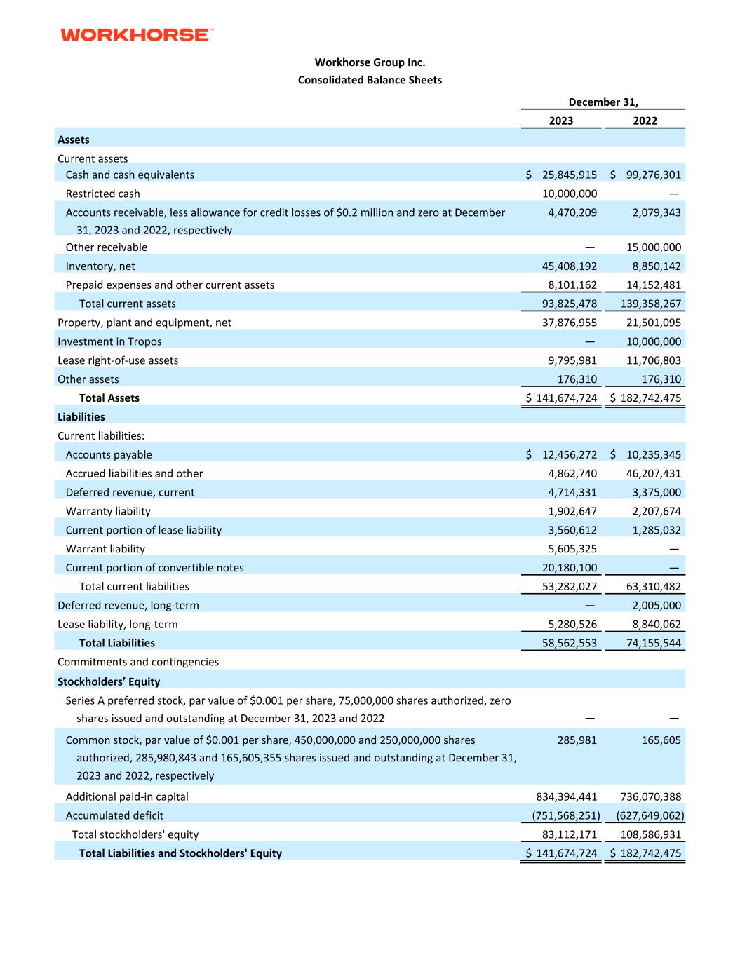 Workhorse Group Inc. Consolidated Balance Sheets December 31, 2023 2022 Assets Current assets Cash and cash equivalents $ 25,845,915 $ 99,276,301 Restricted cash 10,000,000 — Accounts receivable, less allowance for credit losses of $0.2 million and zero at December 31, 2023 and 2022, respectively 4,470,209 2,079,343 Other receivable — 15,000,000 Inventory, net 45,408,192 8,850,142 Prepaid expenses and other current assets 8,101,162 14,152,481 Total current assets 93,825,478 139,358,267 Property, plant and equipment, net 37,876,955 21,501,095 Investment in Tropos — 10,000,000 Lease right-of-use assets 9,795,981 11,706,803 Other assets 176,310 176,310 Total Assets $ 141,674,724 $ 182,742,475 Liabilities Current liabilities: Accounts payable $ 12,456,272 $ 10,235,345 Accrued liabilities and other 4,862,740 46,207,431 Deferred revenue, current 4,714,331 3,375,000 Warranty liability 1,902,647 2,207,674 Current portion of lease liability 3,560,612 1,285,032 Warrant liability 5,605,325 — Current portion of convertible notes 20,180,100 — Total current liabilities 53,282,027 63,310,482 Deferred revenue, long-term — 2,005,000 Lease liability, long-term 5,280,526 8,840,062 Total Liabilities 58,562,553 74,155,544 Commitments and contingencies Stockholders’ Equity Series A preferred stock, par value of $0.001 per share, 75,000,000 shares authorized, zero shares issued and outstanding at December 31, 2023 and 2022 — — Common stock, par value of $0.001 per share, 450,000,000 and 250,000,000 shares authorized, 285,980,843 and 165,605,355 shares issued and outstanding at December 31, 2023 and 2022, respectively 285,981 165,605 Additional paid-in capital 834,394,441 736,070,388 Accumulated deficit (751,568,251) (627,649,062) Total stockholders' equity 83,112,171 108,586,931 Total Liabilities and Stockholders' Equity $ 141,674,724 $ 182,742,475