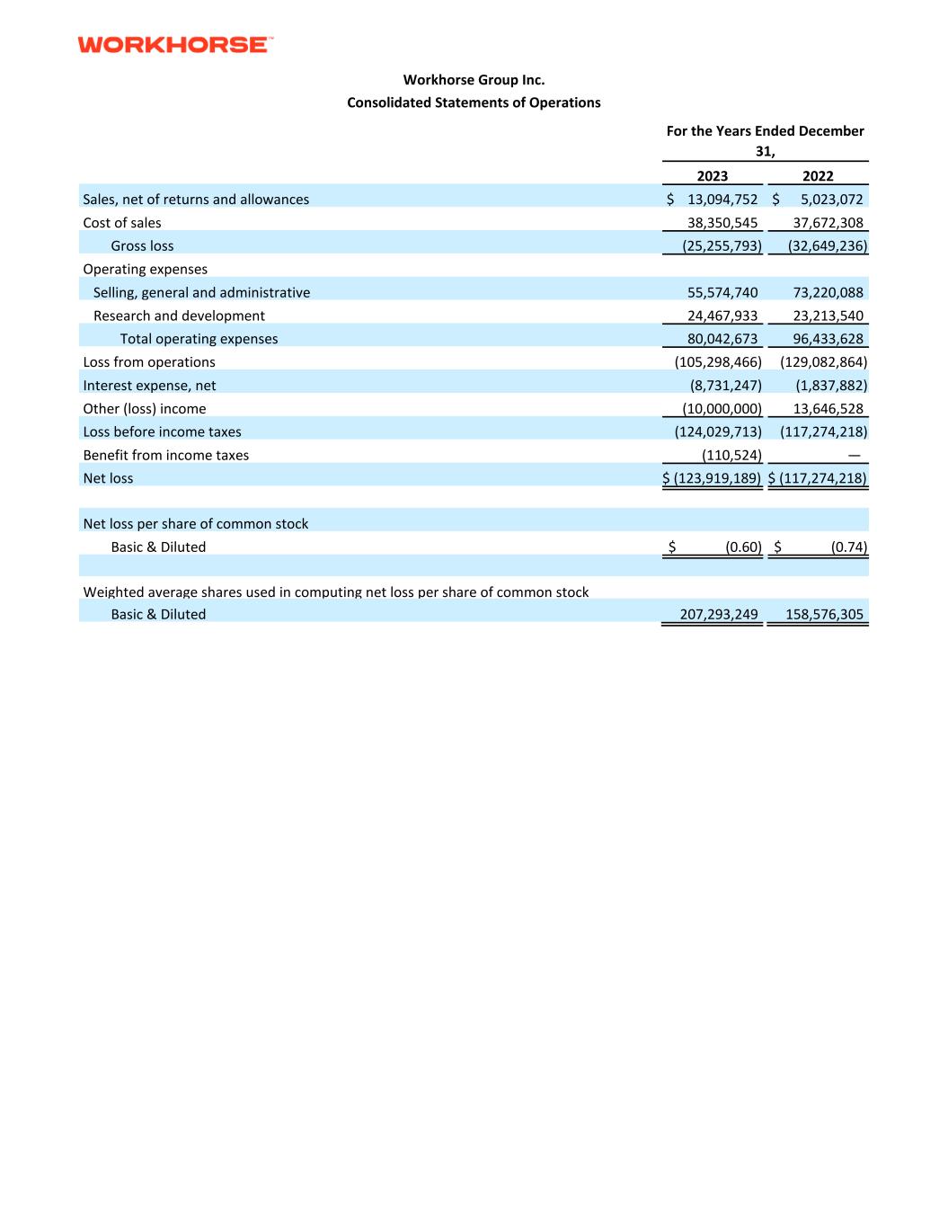 Workhorse Group Inc. Consolidated Statements of Operations For the Years Ended December 31, 2023 2022 Sales, net of returns and allowances $ 13,094,752 $ 5,023,072 Cost of sales 38,350,545 37,672,308 Gross loss (25,255,793) (32,649,236) Operating expenses Selling, general and administrative 55,574,740 73,220,088 Research and development 24,467,933 23,213,540 Total operating expenses 80,042,673 96,433,628 Loss from operations (105,298,466) (129,082,864) Interest expense, net (8,731,247) (1,837,882) Other (loss) income (10,000,000) 13,646,528 Loss before income taxes (124,029,713) (117,274,218) Benefit from income taxes (110,524) — Net loss $ (123,919,189) $ (117,274,218) Net loss per share of common stock Basic & Diluted $ (0.60) $ (0.74) Weighted average shares used in computing net loss per share of common stock Basic & Diluted 207,293,249 158,576,305