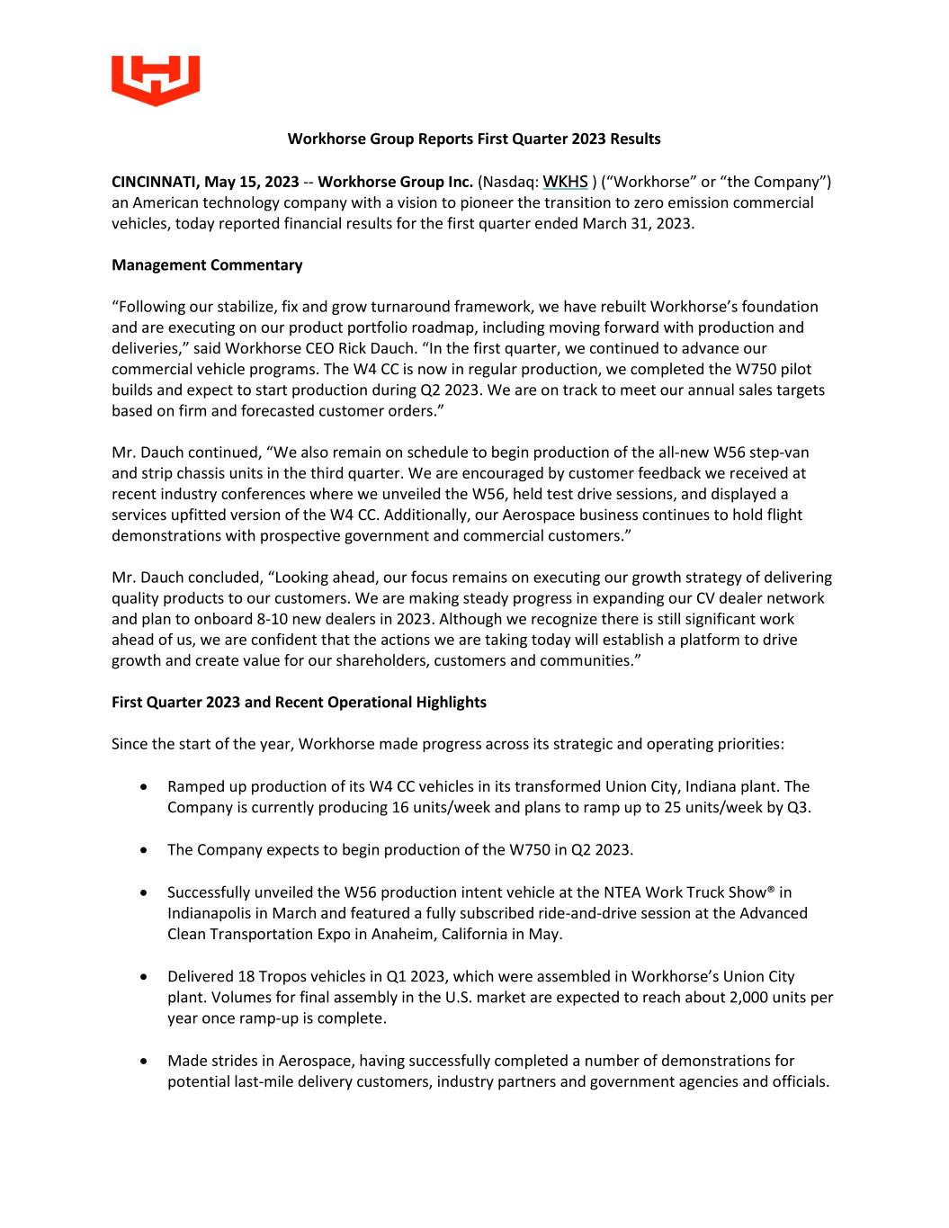 Workhorse Group Reports First Quarter 2023 Results CINCINNATI, May 15, 2023 -- Workhorse Group Inc. (Nasdaq: WKHS ) (“Workhorse” or “the Company”) an American technology company with a vision to pioneer the transition to zero emission commercial vehicles, today reported financial results for the first quarter ended March 31, 2023. Management Commentary “Following our stabilize, fix and grow turnaround framework, we have rebuilt Workhorse’s foundation and are executing on our product portfolio roadmap, including moving forward with production and deliveries,” said Workhorse CEO Rick Dauch. “In the first quarter, we continued to advance our commercial vehicle programs. The W4 CC is now in regular production, we completed the W750 pilot builds and expect to start production during Q2 2023. We are on track to meet our annual sales targets based on firm and forecasted customer orders.” Mr. Dauch continued, “We also remain on schedule to begin production of the all-new W56 step-van and strip chassis units in the third quarter. We are encouraged by customer feedback we received at recent industry conferences where we unveiled the W56, held test drive sessions, and displayed a services upfitted version of the W4 CC. Additionally, our Aerospace business continues to hold flight demonstrations with prospective government and commercial customers.” Mr. Dauch concluded, “Looking ahead, our focus remains on executing our growth strategy of delivering quality products to our customers. We are making steady progress in expanding our CV dealer network and plan to onboard 8-10 new dealers in 2023. Although we recognize there is still significant work ahead of us, we are confident that the actions we are taking today will establish a platform to drive growth and create value for our shareholders, customers and communities.” First Quarter 2023 and Recent Operational Highlights Since the start of the year, Workhorse made progress across its strategic and operating priorities:  Ramped up production of its W4 CC vehicles in its transformed Union City, Indiana plant. The Company is currently producing 16 units/week and plans to ramp up to 25 units/week by Q3.  The Company expects to begin production of the W750 in Q2 2023.  Successfully unveiled the W56 production intent vehicle at the NTEA Work Truck Show® in Indianapolis in March and featured a fully subscribed ride-and-drive session at the Advanced Clean Transportation Expo in Anaheim, California in May.  Delivered 18 Tropos vehicles in Q1 2023, which were assembled in Workhorse’s Union City plant. Volumes for final assembly in the U.S. market are expected to reach about 2,000 units per year once ramp-up is complete.  Made strides in Aerospace, having successfully completed a number of demonstrations for potential last-mile delivery customers, industry partners and government agencies and officials.
