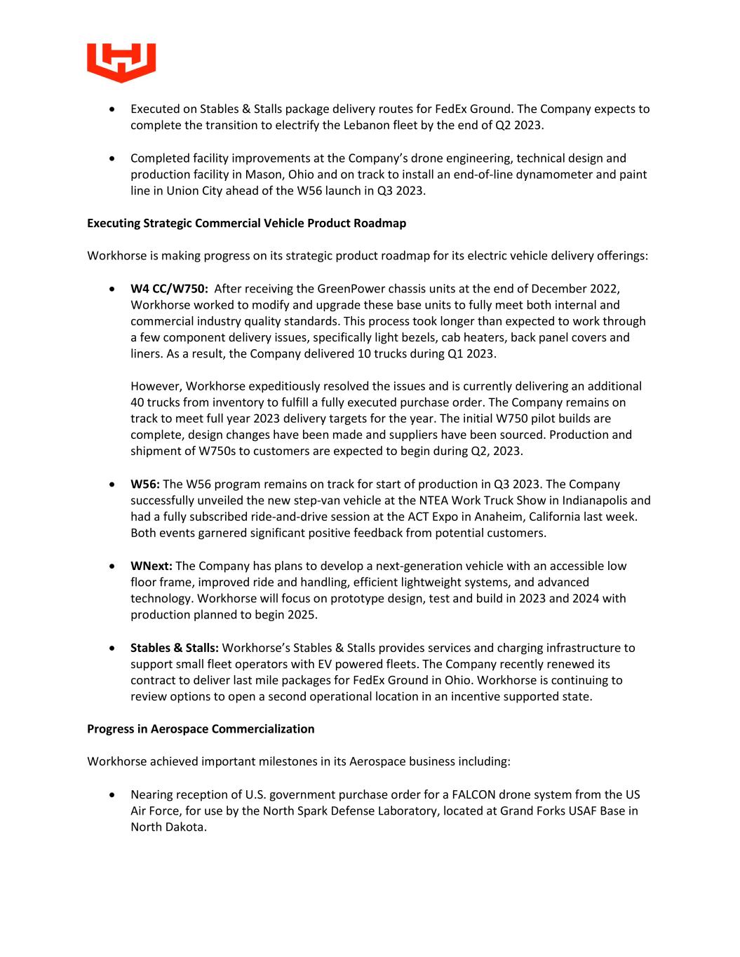  Executed on Stables & Stalls package delivery routes for FedEx Ground. The Company expects to complete the transition to electrify the Lebanon fleet by the end of Q2 2023.  Completed facility improvements at the Company’s drone engineering, technical design and production facility in Mason, Ohio and on track to install an end-of-line dynamometer and paint line in Union City ahead of the W56 launch in Q3 2023. Executing Strategic Commercial Vehicle Product Roadmap Workhorse is making progress on its strategic product roadmap for its electric vehicle delivery offerings:  W4 CC/W750: After receiving the GreenPower chassis units at the end of December 2022, Workhorse worked to modify and upgrade these base units to fully meet both internal and commercial industry quality standards. This process took longer than expected to work through a few component delivery issues, specifically light bezels, cab heaters, back panel covers and liners. As a result, the Company delivered 10 trucks during Q1 2023. However, Workhorse expeditiously resolved the issues and is currently delivering an additional 40 trucks from inventory to fulfill a fully executed purchase order. The Company remains on track to meet full year 2023 delivery targets for the year. The initial W750 pilot builds are complete, design changes have been made and suppliers have been sourced. Production and shipment of W750s to customers are expected to begin during Q2, 2023.  W56: The W56 program remains on track for start of production in Q3 2023. The Company successfully unveiled the new step-van vehicle at the NTEA Work Truck Show in Indianapolis and had a fully subscribed ride-and-drive session at the ACT Expo in Anaheim, California last week. Both events garnered significant positive feedback from potential customers.  WNext: The Company has plans to develop a next-generation vehicle with an accessible low floor frame, improved ride and handling, efficient lightweight systems, and advanced technology. Workhorse will focus on prototype design, test and build in 2023 and 2024 with production planned to begin 2025.  Stables & Stalls: Workhorse’s Stables & Stalls provides services and charging infrastructure to support small fleet operators with EV powered fleets. The Company recently renewed its contract to deliver last mile packages for FedEx Ground in Ohio. Workhorse is continuing to review options to open a second operational location in an incentive supported state. Progress in Aerospace Commercialization Workhorse achieved important milestones in its Aerospace business including:  Nearing reception of U.S. government purchase order for a FALCON drone system from the US Air Force, for use by the North Spark Defense Laboratory, located at Grand Forks USAF Base in North Dakota.