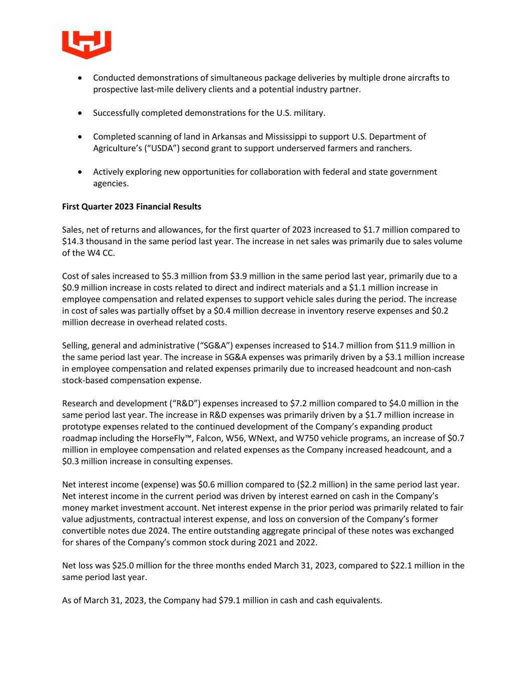  Conducted demonstrations of simultaneous package deliveries by multiple drone aircrafts to prospective last-mile delivery clients and a potential industry partner.  Successfully completed demonstrations for the U.S. military.  Completed scanning of land in Arkansas and Mississippi to support U.S. Department of Agriculture’s (“USDA”) second grant to support underserved farmers and ranchers.  Actively exploring new opportunities for collaboration with federal and state government agencies. First Quarter 2023 Financial Results Sales, net of returns and allowances, for the first quarter of 2023 increased to $1.7 million compared to $14.3 thousand in the same period last year. The increase in net sales was primarily due to sales volume of the W4 CC. Cost of sales increased to $5.3 million from $3.9 million in the same period last year, primarily due to a $0.9 million increase in costs related to direct and indirect materials and a $1.1 million increase in employee compensation and related expenses to support vehicle sales during the period. The increase in cost of sales was partially offset by a $0.4 million decrease in inventory reserve expenses and $0.2 million decrease in overhead related costs. Selling, general and administrative (“SG&A”) expenses increased to $14.7 million from $11.9 million in the same period last year. The increase in SG&A expenses was primarily driven by a $3.1 million increase in employee compensation and related expenses primarily due to increased headcount and non-cash stock-based compensation expense. Research and development (“R&D”) expenses increased to $7.2 million compared to $4.0 million in the same period last year. The increase in R&D expenses was primarily driven by a $1.7 million increase in prototype expenses related to the continued development of the Company’s expanding product roadmap including the HorseFly™, Falcon, W56, WNext, and W750 vehicle programs, an increase of $0.7 million in employee compensation and related expenses as the Company increased headcount, and a $0.3 million increase in consulting expenses. Net interest income (expense) was $0.6 million compared to ($2.2 million) in the same period last year. Net interest income in the current period was driven by interest earned on cash in the Company’s money market investment account. Net interest expense in the prior period was primarily related to fair value adjustments, contractual interest expense, and loss on conversion of the Company’s former convertible notes due 2024. The entire outstanding aggregate principal of these notes was exchanged for shares of the Company’s common stock during 2021 and 2022. Net loss was $25.0 million for the three months ended March 31, 2023, compared to $22.1 million in the same period last year. As of March 31, 2023, the Company had $79.1 million in cash and cash equivalents.