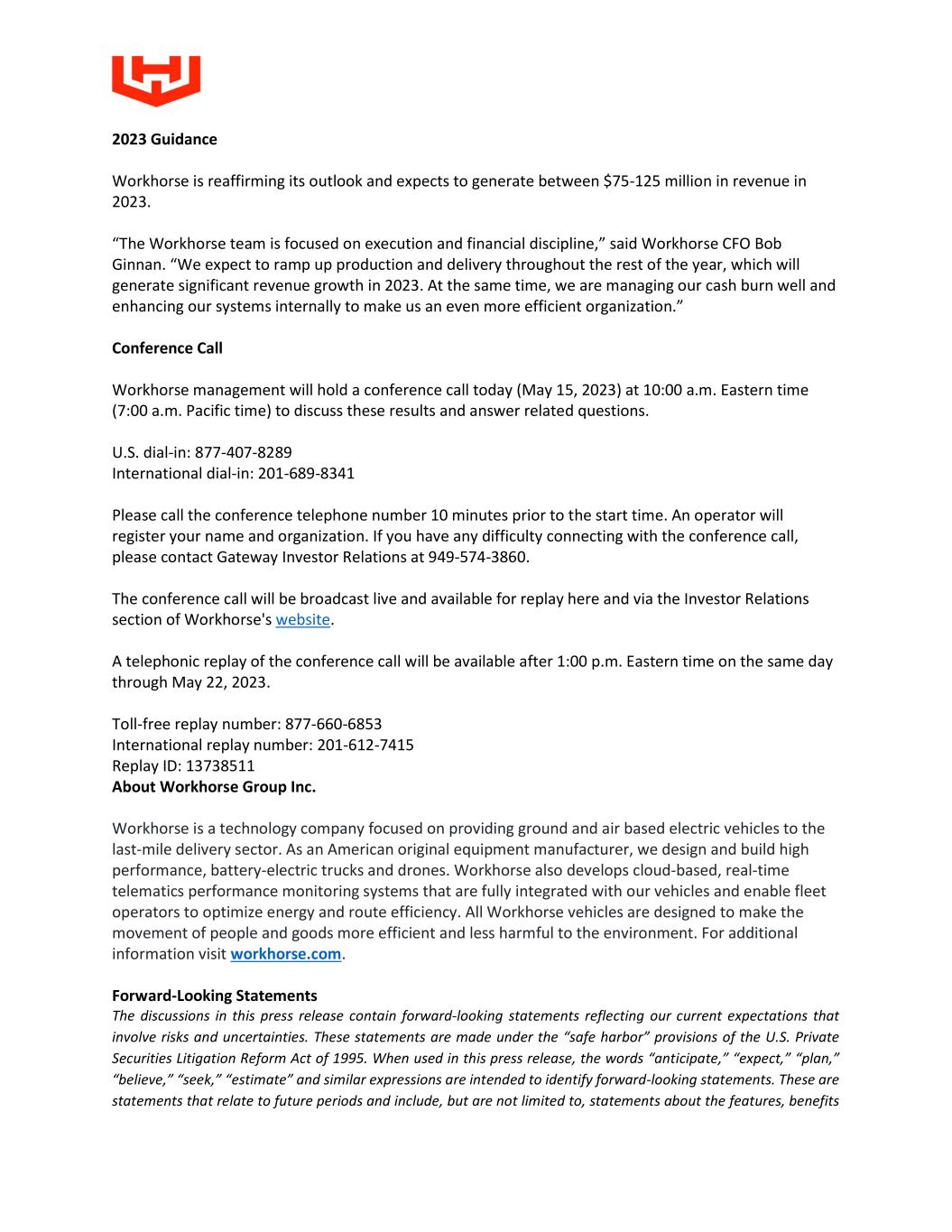 2023 Guidance Workhorse is reaffirming its outlook and expects to generate between $75-125 million in revenue in 2023. “The Workhorse team is focused on execution and financial discipline,” said Workhorse CFO Bob Ginnan. “We expect to ramp up production and delivery throughout the rest of the year, which will generate significant revenue growth in 2023. At the same time, we are managing our cash burn well and enhancing our systems internally to make us an even more efficient organization.” Conference Call Workhorse management will hold a conference call today (May 15, 2023) at 10:00 a.m. Eastern time (7:00 a.m. Pacific time) to discuss these results and answer related questions. U.S. dial-in: 877-407-8289 International dial-in: 201-689-8341 Please call the conference telephone number 10 minutes prior to the start time. An operator will register your name and organization. If you have any difficulty connecting with the conference call, please contact Gateway Investor Relations at 949-574-3860. The conference call will be broadcast live and available for replay here and via the Investor Relations section of Workhorse's website. A telephonic replay of the conference call will be available after 1:00 p.m. Eastern time on the same day through May 22, 2023. Toll-free replay number: 877-660-6853 International replay number: 201-612-7415 Replay ID: 13738511 About Workhorse Group Inc. Workhorse is a technology company focused on providing ground and air based electric vehicles to the last-mile delivery sector. As an American original equipment manufacturer, we design and build high performance, battery-electric trucks and drones. Workhorse also develops cloud-based, real-time telematics performance monitoring systems that are fully integrated with our vehicles and enable fleet operators to optimize energy and route efficiency. All Workhorse vehicles are designed to make the movement of people and goods more efficient and less harmful to the environment. For additional information visit workhorse.com. Forward-Looking Statements The discussions in this press release contain forward-looking statements reflecting our current expectations that involve risks and uncertainties. These statements are made under the “safe harbor” provisions of the U.S. Private Securities Litigation Reform Act of 1995. When used in this press release, the words “anticipate,” “expect,” “plan,” “believe,” “seek,” “estimate” and similar expressions are intended to identify forward-looking statements. These are statements that relate to future periods and include, but are not limited to, statements about the features, benefits