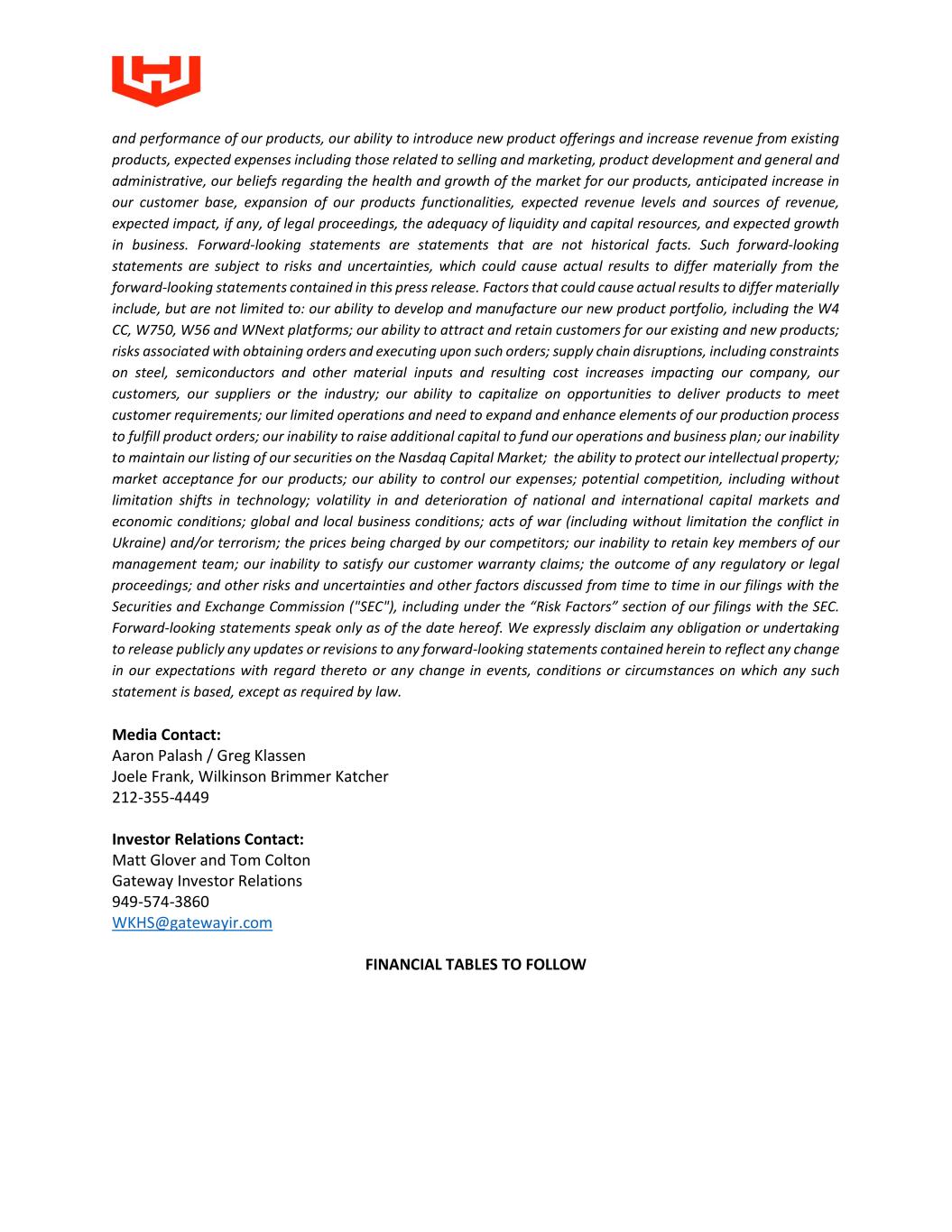 and performance of our products, our ability to introduce new product offerings and increase revenue from existing products, expected expenses including those related to selling and marketing, product development and general and administrative, our beliefs regarding the health and growth of the market for our products, anticipated increase in our customer base, expansion of our products functionalities, expected revenue levels and sources of revenue, expected impact, if any, of legal proceedings, the adequacy of liquidity and capital resources, and expected growth in business. Forward-looking statements are statements that are not historical facts. Such forward-looking statements are subject to risks and uncertainties, which could cause actual results to differ materially from the forward-looking statements contained in this press release. Factors that could cause actual results to differ materially include, but are not limited to: our ability to develop and manufacture our new product portfolio, including the W4 CC, W750, W56 and WNext platforms; our ability to attract and retain customers for our existing and new products; risks associated with obtaining orders and executing upon such orders; supply chain disruptions, including constraints on steel, semiconductors and other material inputs and resulting cost increases impacting our company, our customers, our suppliers or the industry; our ability to capitalize on opportunities to deliver products to meet customer requirements; our limited operations and need to expand and enhance elements of our production process to fulfill product orders; our inability to raise additional capital to fund our operations and business plan; our inability to maintain our listing of our securities on the Nasdaq Capital Market; the ability to protect our intellectual property; market acceptance for our products; our ability to control our expenses; potential competition, including without limitation shifts in technology; volatility in and deterioration of national and international capital markets and economic conditions; global and local business conditions; acts of war (including without limitation the conflict in Ukraine) and/or terrorism; the prices being charged by our competitors; our inability to retain key members of our management team; our inability to satisfy our customer warranty claims; the outcome of any regulatory or legal proceedings; and other risks and uncertainties and other factors discussed from time to time in our filings with the Securities and Exchange Commission ("SEC"), including under the “Risk Factors” section of our filings with the SEC. Forward-looking statements speak only as of the date hereof. We expressly disclaim any obligation or undertaking to release publicly any updates or revisions to any forward-looking statements contained herein to reflect any change in our expectations with regard thereto or any change in events, conditions or circumstances on which any such statement is based, except as required by law. Media Contact: Aaron Palash / Greg Klassen Joele Frank, Wilkinson Brimmer Katcher 212-355-4449 Investor Relations Contact: Matt Glover and Tom Colton Gateway Investor Relations 949-574-3860 WKHS@gatewayir.com FINANCIAL TABLES TO FOLLOW