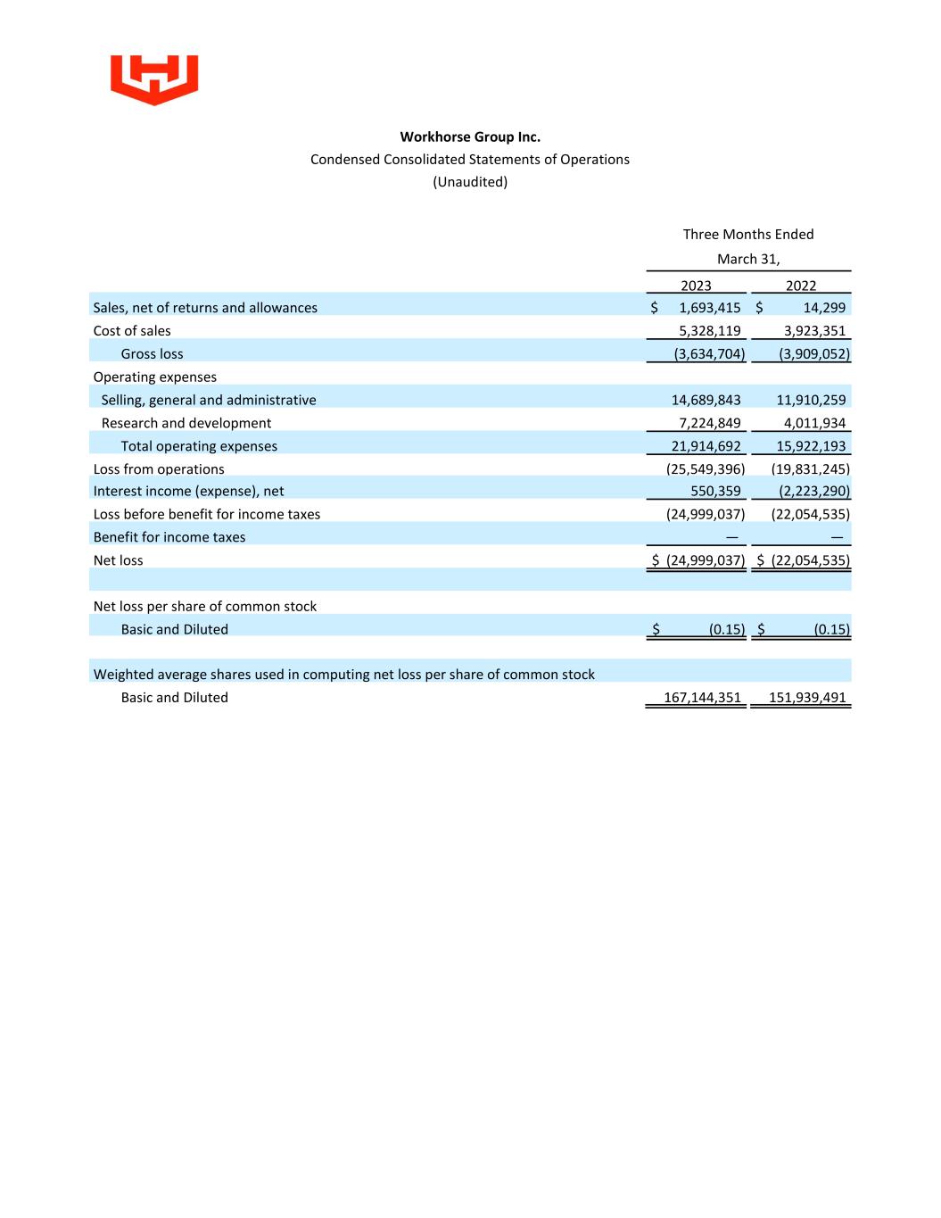 Workhorse Group Inc. Condensed Consolidated Statements of Operations (Unaudited) Three Months Ended March 31, 2023 2022 Sales, net of returns and allowances $ 1,693,415 $ 14,299 Cost of sales 5,328,119 3,923,351 Gross loss (3,634,704) (3,909,052) Operating expenses Selling, general and administrative 14,689,843 11,910,259 Research and development 7,224,849 4,011,934 Total operating expenses 21,914,692 15,922,193 Loss from operations (25,549,396) (19,831,245) Interest income (expense), net 550,359 (2,223,290) Loss before benefit for income taxes (24,999,037) (22,054,535) Benefit for income taxes — — Net loss $ (24,999,037) $ (22,054,535) Net loss per share of common stock Basic and Diluted $ (0.15) $ (0.15) Weighted average shares used in computing net loss per share of common stock Basic and Diluted 167,144,351 151,939,491