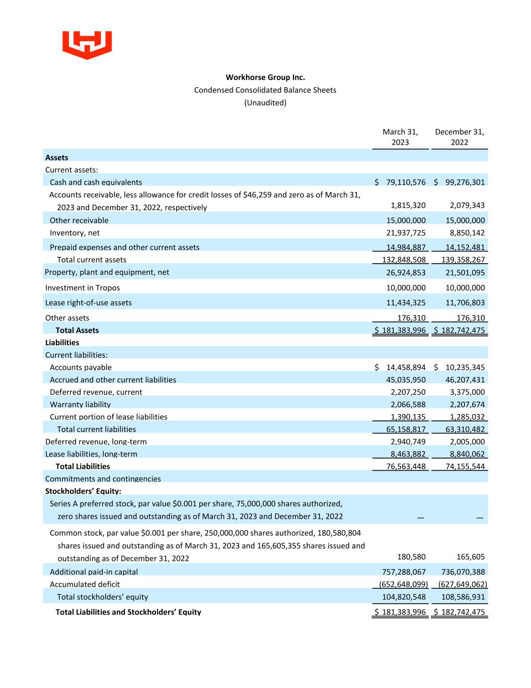 Workhorse Group Inc. Condensed Consolidated Balance Sheets (Unaudited) March 31, 2023 December 31, 2022 Assets Current assets: Cash and cash equivalents $ 79,110,576 $ 99,276,301 Accounts receivable, less allowance for credit losses of $46,259 and zero as of March 31, 2023 and December 31, 2022, respectively 1,815,320 2,079,343 Other receivable 15,000,000 15,000,000 Inventory, net 21,937,725 8,850,142 Prepaid expenses and other current assets 14,984,887 14,152,481 Total current assets 132,848,508 139,358,267 Property, plant and equipment, net 26,924,853 21,501,095 Investment in Tropos 10,000,000 10,000,000 Lease right-of-use assets 11,434,325 11,706,803 Other assets 176,310 176,310 Total Assets $ 181,383,996 $ 182,742,475 Liabilities Current liabilities: Accounts payable $ 14,458,894 $ 10,235,345 Accrued and other current liabilities 45,035,950 46,207,431 Deferred revenue, current 2,207,250 3,375,000 Warranty liability 2,066,588 2,207,674 Current portion of lease liabilities 1,390,135 1,285,032 Total current liabilities 65,158,817 63,310,482 Deferred revenue, long-term 2,940,749 2,005,000 Lease liabilities, long-term 8,463,882 8,840,062 Total Liabilities 76,563,448 74,155,544 Commitments and contingencies Stockholders’ Equity: Series A preferred stock, par value $0.001 per share, 75,000,000 shares authorized, zero shares issued and outstanding as of March 31, 2023 and December 31, 2022 — — Common stock, par value $0.001 per share, 250,000,000 shares authorized, 180,580,804 shares issued and outstanding as of March 31, 2023 and 165,605,355 shares issued and outstanding as of December 31, 2022 180,580 165,605 Additional paid-in capital 757,288,067 736,070,388 Accumulated deficit (652,648,099) (627,649,062) Total stockholders’ equity 104,820,548 108,586,931 Total Liabilities and Stockholders’ Equity $ 181,383,996 $ 182,742,475