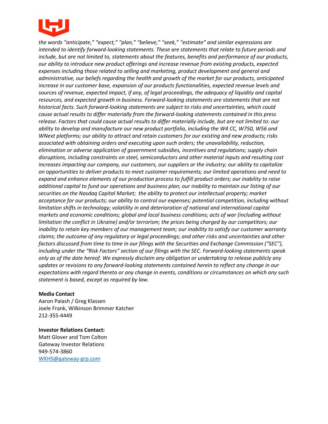 the words “anticipate,” “expect,” “plan,” “believe,” “seek,” “estimate” and similar expressions are intended to identify forward-looking statements. These are statements that relate to future periods and include, but are not limited to, statements about the features, benefits and performance of our products, our ability to introduce new product offerings and increase revenue from existing products, expected expenses including those related to selling and marketing, product development and general and administrative, our beliefs regarding the health and growth of the market for our products, anticipated increase in our customer base, expansion of our products functionalities, expected revenue levels and sources of revenue, expected impact, if any, of legal proceedings, the adequacy of liquidity and capital resources, and expected growth in business. Forward-looking statements are statements that are not historical facts. Such forward-looking statements are subject to risks and uncertainties, which could cause actual results to differ materially from the forward-looking statements contained in this press release. Factors that could cause actual results to differ materially include, but are not limited to: our ability to develop and manufacture our new product portfolio, including the W4 CC, W750, W56 and WNext platforms; our ability to attract and retain customers for our existing and new products; risks associated with obtaining orders and executing upon such orders; the unavailability, reduction, elimination or adverse application of government subsidies, incentives and regulations; supply chain disruptions, including constraints on steel, semiconductors and other material inputs and resulting cost increases impacting our company, our customers, our suppliers or the industry; our ability to capitalize on opportunities to deliver products to meet customer requirements; our limited operations and need to expand and enhance elements of our production process to fulfill product orders; our inability to raise additional capital to fund our operations and business plan; our inability to maintain our listing of our securities on the Nasdaq Capital Market; the ability to protect our intellectual property; market acceptance for our products; our ability to control our expenses; potential competition, including without limitation shifts in technology; volatility in and deterioration of national and international capital markets and economic conditions; global and local business conditions; acts of war (including without limitation the conflict in Ukraine) and/or terrorism; the prices being charged by our competitors; our inability to retain key members of our management team; our inability to satisfy our customer warranty claims; the outcome of any regulatory or legal proceedings; and other risks and uncertainties and other factors discussed from time to time in our filings with the Securities and Exchange Commission ("SEC"), including under the “Risk Factors” section of our filings with the SEC. Forward-looking statements speak only as of the date hereof. We expressly disclaim any obligation or undertaking to release publicly any updates or revisions to any forward-looking statements contained herein to reflect any change in our expectations with regard thereto or any change in events, conditions or circumstances on which any such statement is based, except as required by law. Media Contact Aaron Palash / Greg Klassen Joele Frank, Wilkinson Brimmer Katcher 212-355-4449 Investor Relations Contact: Matt Glover and Tom Colton Gateway Investor Relations 949-574-3860 WKHS@gateway-grp.com