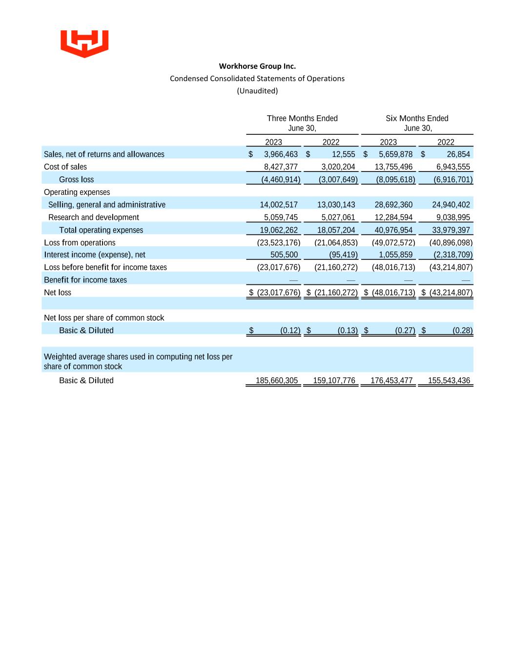 Workhorse Group Inc. Condensed Consolidated Statements of Operations (Unaudited) Three Months Ended June 30, Six Months Ended June 30, 2023 2022 2023 2022 Sales, net of returns and allowances $ 3,966,463 $ 12,555 $ 5,659,878 $ 26,854 Cost of sales 8,427,377 3,020,204 13,755,496 6,943,555 Gross loss (4,460,914) (3,007,649) (8,095,618) (6,916,701) Operating expenses Selling, general and administrative 14,002,517 13,030,143 28,692,360 24,940,402 Research and development 5,059,745 5,027,061 12,284,594 9,038,995 Total operating expenses 19,062,262 18,057,204 40,976,954 33,979,397 Loss from operations (23,523,176) (21,064,853) (49,072,572) (40,896,098) Interest income (expense), net 505,500 (95,419) 1,055,859 (2,318,709) Loss before benefit for income taxes (23,017,676) (21,160,272) (48,016,713) (43,214,807) Benefit for income taxes — — — — Net loss $ (23,017,676) $ (21,160,272) $ (48,016,713) $ (43,214,807) Net loss per share of common stock Basic & Diluted $ (0.12) $ (0.13) $ (0.27) $ (0.28) Weighted average shares used in computing net loss per share of common stock Basic & Diluted 185,660,305 159,107,776 176,453,477 155,543,436