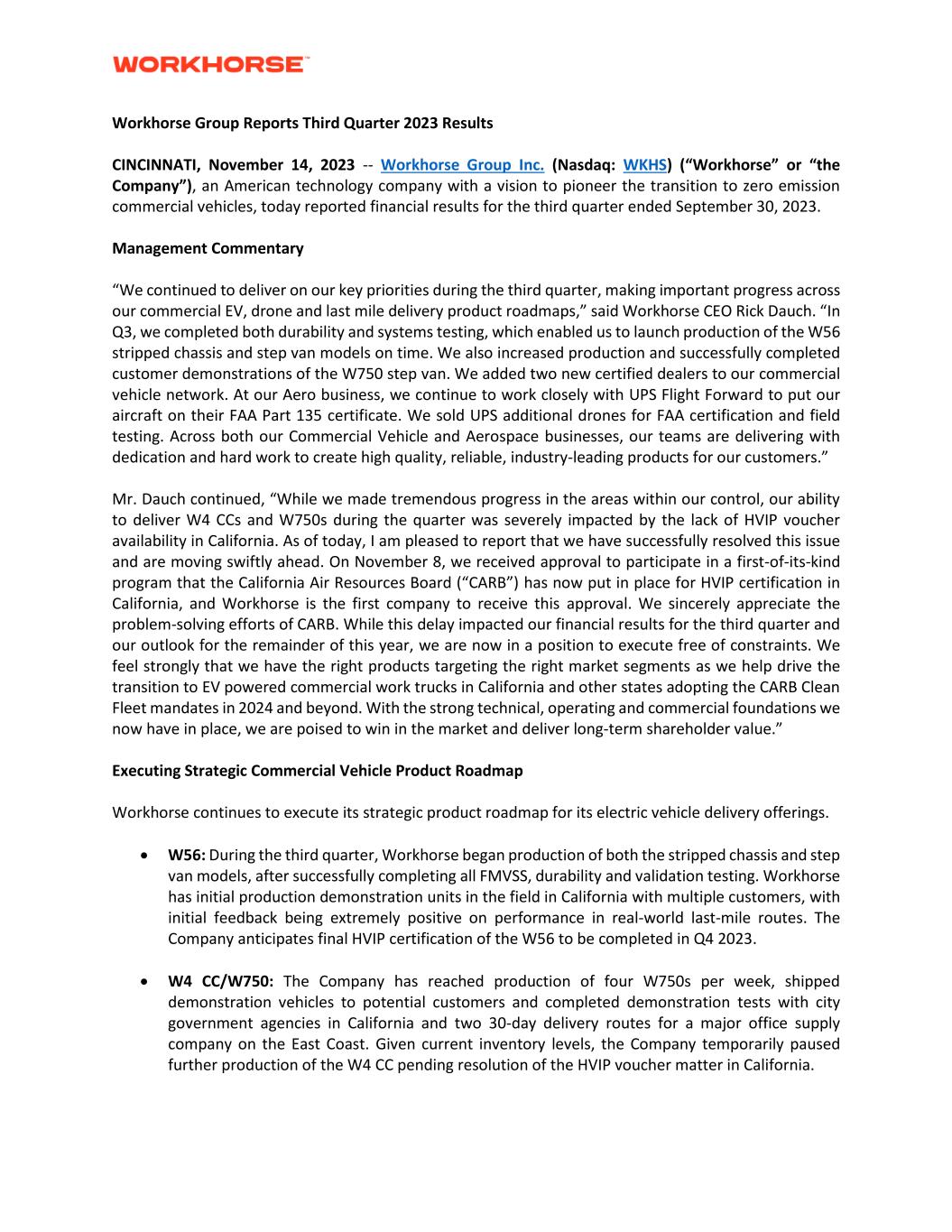 Workhorse Group Reports Third Quarter 2023 Results CINCINNATI, November 14, 2023 -- Workhorse Group Inc. (Nasdaq: WKHS) (“Workhorse” or “the Company”), an American technology company with a vision to pioneer the transition to zero emission commercial vehicles, today reported financial results for the third quarter ended September 30, 2023. Management Commentary “We continued to deliver on our key priorities during the third quarter, making important progress across our commercial EV, drone and last mile delivery product roadmaps,” said Workhorse CEO Rick Dauch. “In Q3, we completed both durability and systems testing, which enabled us to launch production of the W56 stripped chassis and step van models on time. We also increased production and successfully completed customer demonstrations of the W750 step van. We added two new certified dealers to our commercial vehicle network. At our Aero business, we continue to work closely with UPS Flight Forward to put our aircraft on their FAA Part 135 certificate. We sold UPS additional drones for FAA certification and field testing. Across both our Commercial Vehicle and Aerospace businesses, our teams are delivering with dedication and hard work to create high quality, reliable, industry-leading products for our customers.” Mr. Dauch continued, “While we made tremendous progress in the areas within our control, our ability to deliver W4 CCs and W750s during the quarter was severely impacted by the lack of HVIP voucher availability in California. As of today, I am pleased to report that we have successfully resolved this issue and are moving swiftly ahead. On November 8, we received approval to participate in a first-of-its-kind program that the California Air Resources Board (“CARB”) has now put in place for HVIP certification in California, and Workhorse is the first company to receive this approval. We sincerely appreciate the problem-solving efforts of CARB. While this delay impacted our financial results for the third quarter and our outlook for the remainder of this year, we are now in a position to execute free of constraints. We feel strongly that we have the right products targeting the right market segments as we help drive the transition to EV powered commercial work trucks in California and other states adopting the CARB Clean Fleet mandates in 2024 and beyond. With the strong technical, operating and commercial foundations we now have in place, we are poised to win in the market and deliver long-term shareholder value.” Executing Strategic Commercial Vehicle Product Roadmap Workhorse continues to execute its strategic product roadmap for its electric vehicle delivery offerings. • W56: During the third quarter, Workhorse began production of both the stripped chassis and step van models, after successfully completing all FMVSS, durability and validation testing. Workhorse has initial production demonstration units in the field in California with multiple customers, with initial feedback being extremely positive on performance in real-world last-mile routes. The Company anticipates final HVIP certification of the W56 to be completed in Q4 2023. • W4 CC/W750: The Company has reached production of four W750s per week, shipped demonstration vehicles to potential customers and completed demonstration tests with city government agencies in California and two 30-day delivery routes for a major office supply company on the East Coast. Given current inventory levels, the Company temporarily paused further production of the W4 CC pending resolution of the HVIP voucher matter in California.