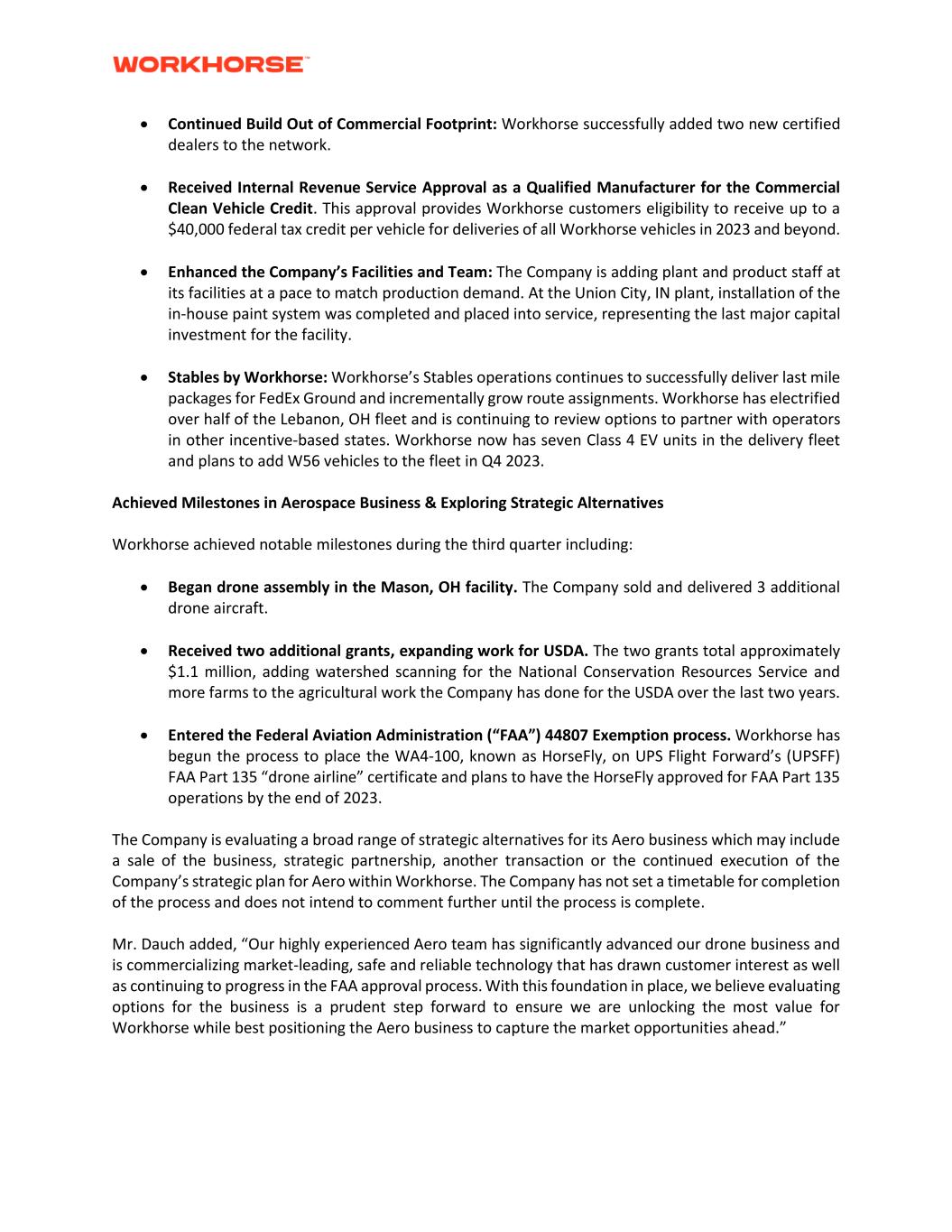 • Continued Build Out of Commercial Footprint: Workhorse successfully added two new certified dealers to the network. • Received Internal Revenue Service Approval as a Qualified Manufacturer for the Commercial Clean Vehicle Credit. This approval provides Workhorse customers eligibility to receive up to a $40,000 federal tax credit per vehicle for deliveries of all Workhorse vehicles in 2023 and beyond. • Enhanced the Company’s Facilities and Team: The Company is adding plant and product staff at its facilities at a pace to match production demand. At the Union City, IN plant, installation of the in-house paint system was completed and placed into service, representing the last major capital investment for the facility. • Stables by Workhorse: Workhorse’s Stables operations continues to successfully deliver last mile packages for FedEx Ground and incrementally grow route assignments. Workhorse has electrified over half of the Lebanon, OH fleet and is continuing to review options to partner with operators in other incentive-based states. Workhorse now has seven Class 4 EV units in the delivery fleet and plans to add W56 vehicles to the fleet in Q4 2023. Achieved Milestones in Aerospace Business & Exploring Strategic Alternatives Workhorse achieved notable milestones during the third quarter including: • Began drone assembly in the Mason, OH facility. The Company sold and delivered 3 additional drone aircraft. • Received two additional grants, expanding work for USDA. The two grants total approximately $1.1 million, adding watershed scanning for the National Conservation Resources Service and more farms to the agricultural work the Company has done for the USDA over the last two years. • Entered the Federal Aviation Administration (“FAA”) 44807 Exemption process. Workhorse has begun the process to place the WA4-100, known as HorseFly, on UPS Flight Forward’s (UPSFF) FAA Part 135 “drone airline” certificate and plans to have the HorseFly approved for FAA Part 135 operations by the end of 2023. The Company is evaluating a broad range of strategic alternatives for its Aero business which may include a sale of the business, strategic partnership, another transaction or the continued execution of the Company’s strategic plan for Aero within Workhorse. The Company has not set a timetable for completion of the process and does not intend to comment further until the process is complete. Mr. Dauch added, “Our highly experienced Aero team has significantly advanced our drone business and is commercializing market-leading, safe and reliable technology that has drawn customer interest as well as continuing to progress in the FAA approval process. With this foundation in place, we believe evaluating options for the business is a prudent step forward to ensure we are unlocking the most value for Workhorse while best positioning the Aero business to capture the market opportunities ahead.”