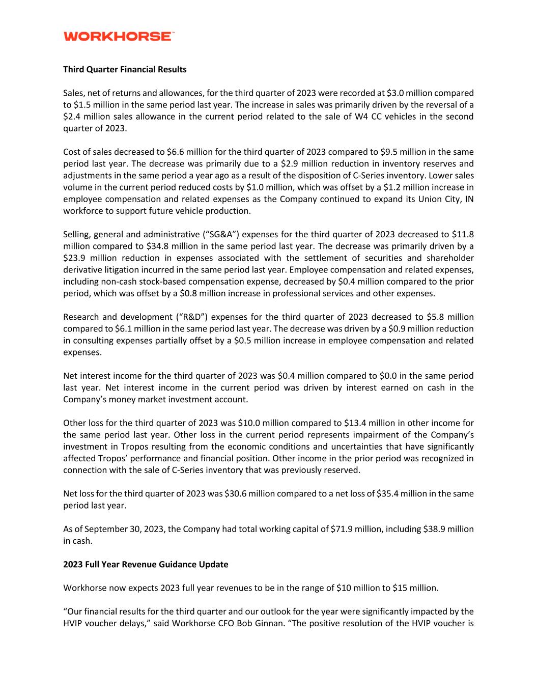 Third Quarter Financial Results Sales, net of returns and allowances, for the third quarter of 2023 were recorded at $3.0 million compared to $1.5 million in the same period last year. The increase in sales was primarily driven by the reversal of a $2.4 million sales allowance in the current period related to the sale of W4 CC vehicles in the second quarter of 2023. Cost of sales decreased to $6.6 million for the third quarter of 2023 compared to $9.5 million in the same period last year. The decrease was primarily due to a $2.9 million reduction in inventory reserves and adjustments in the same period a year ago as a result of the disposition of C-Series inventory. Lower sales volume in the current period reduced costs by $1.0 million, which was offset by a $1.2 million increase in employee compensation and related expenses as the Company continued to expand its Union City, IN workforce to support future vehicle production. Selling, general and administrative (“SG&A”) expenses for the third quarter of 2023 decreased to $11.8 million compared to $34.8 million in the same period last year. The decrease was primarily driven by a $23.9 million reduction in expenses associated with the settlement of securities and shareholder derivative litigation incurred in the same period last year. Employee compensation and related expenses, including non-cash stock-based compensation expense, decreased by $0.4 million compared to the prior period, which was offset by a $0.8 million increase in professional services and other expenses. Research and development (“R&D”) expenses for the third quarter of 2023 decreased to $5.8 million compared to $6.1 million in the same period last year. The decrease was driven by a $0.9 million reduction in consulting expenses partially offset by a $0.5 million increase in employee compensation and related expenses. Net interest income for the third quarter of 2023 was $0.4 million compared to $0.0 in the same period last year. Net interest income in the current period was driven by interest earned on cash in the Company’s money market investment account. Other loss for the third quarter of 2023 was $10.0 million compared to $13.4 million in other income for the same period last year. Other loss in the current period represents impairment of the Company’s investment in Tropos resulting from the economic conditions and uncertainties that have significantly affected Tropos’ performance and financial position. Other income in the prior period was recognized in connection with the sale of C-Series inventory that was previously reserved. Net loss for the third quarter of 2023 was $30.6 million compared to a net loss of $35.4 million in the same period last year. As of September 30, 2023, the Company had total working capital of $71.9 million, including $38.9 million in cash. 2023 Full Year Revenue Guidance Update Workhorse now expects 2023 full year revenues to be in the range of $10 million to $15 million. “Our financial results for the third quarter and our outlook for the year were significantly impacted by the HVIP voucher delays,” said Workhorse CFO Bob Ginnan. “The positive resolution of the HVIP voucher is
