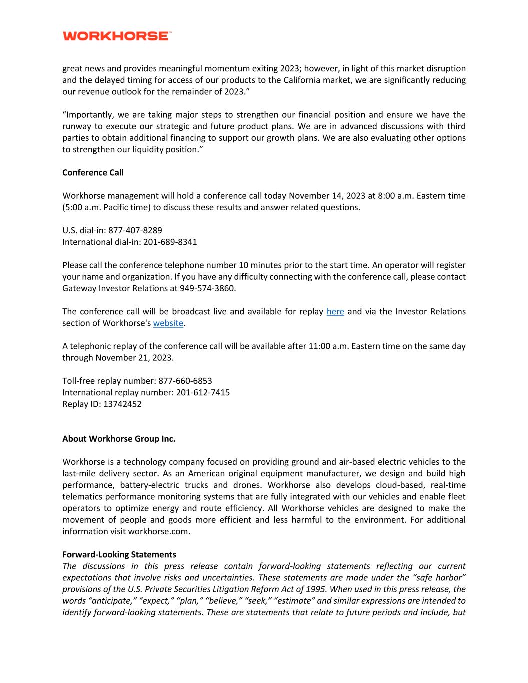 great news and provides meaningful momentum exiting 2023; however, in light of this market disruption and the delayed timing for access of our products to the California market, we are significantly reducing our revenue outlook for the remainder of 2023.” “Importantly, we are taking major steps to strengthen our financial position and ensure we have the runway to execute our strategic and future product plans. We are in advanced discussions with third parties to obtain additional financing to support our growth plans. We are also evaluating other options to strengthen our liquidity position.” Conference Call Workhorse management will hold a conference call today November 14, 2023 at 8:00 a.m. Eastern time (5:00 a.m. Pacific time) to discuss these results and answer related questions. U.S. dial-in: 877-407-8289 International dial-in: 201-689-8341 Please call the conference telephone number 10 minutes prior to the start time. An operator will register your name and organization. If you have any difficulty connecting with the conference call, please contact Gateway Investor Relations at 949-574-3860. The conference call will be broadcast live and available for replay here and via the Investor Relations section of Workhorse's website. A telephonic replay of the conference call will be available after 11:00 a.m. Eastern time on the same day through November 21, 2023. Toll-free replay number: 877-660-6853 International replay number: 201-612-7415 Replay ID: 13742452 About Workhorse Group Inc. Workhorse is a technology company focused on providing ground and air-based electric vehicles to the last-mile delivery sector. As an American original equipment manufacturer, we design and build high performance, battery-electric trucks and drones. Workhorse also develops cloud-based, real-time telematics performance monitoring systems that are fully integrated with our vehicles and enable fleet operators to optimize energy and route efficiency. All Workhorse vehicles are designed to make the movement of people and goods more efficient and less harmful to the environment. For additional information visit workhorse.com. Forward-Looking Statements The discussions in this press release contain forward-looking statements reflecting our current expectations that involve risks and uncertainties. These statements are made under the “safe harbor” provisions of the U.S. Private Securities Litigation Reform Act of 1995. When used in this press release, the words “anticipate,” “expect,” “plan,” “believe,” “seek,” “estimate” and similar expressions are intended to identify forward-looking statements. These are statements that relate to future periods and include, but