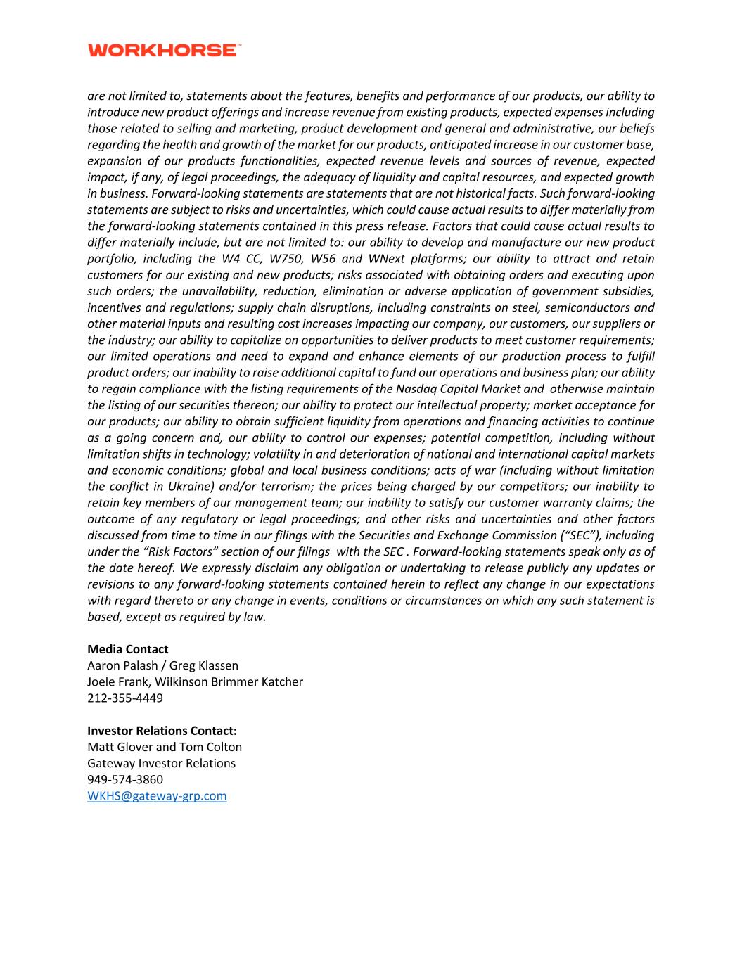 are not limited to, statements about the features, benefits and performance of our products, our ability to introduce new product offerings and increase revenue from existing products, expected expenses including those related to selling and marketing, product development and general and administrative, our beliefs regarding the health and growth of the market for our products, anticipated increase in our customer base, expansion of our products functionalities, expected revenue levels and sources of revenue, expected impact, if any, of legal proceedings, the adequacy of liquidity and capital resources, and expected growth in business. Forward-looking statements are statements that are not historical facts. Such forward-looking statements are subject to risks and uncertainties, which could cause actual results to differ materially from the forward-looking statements contained in this press release. Factors that could cause actual results to differ materially include, but are not limited to: our ability to develop and manufacture our new product portfolio, including the W4 CC, W750, W56 and WNext platforms; our ability to attract and retain customers for our existing and new products; risks associated with obtaining orders and executing upon such orders; the unavailability, reduction, elimination or adverse application of government subsidies, incentives and regulations; supply chain disruptions, including constraints on steel, semiconductors and other material inputs and resulting cost increases impacting our company, our customers, our suppliers or the industry; our ability to capitalize on opportunities to deliver products to meet customer requirements; our limited operations and need to expand and enhance elements of our production process to fulfill product orders; our inability to raise additional capital to fund our operations and business plan; our ability to regain compliance with the listing requirements of the Nasdaq Capital Market and otherwise maintain the listing of our securities thereon; our ability to protect our intellectual property; market acceptance for our products; our ability to obtain sufficient liquidity from operations and financing activities to continue as a going concern and, our ability to control our expenses; potential competition, including without limitation shifts in technology; volatility in and deterioration of national and international capital markets and economic conditions; global and local business conditions; acts of war (including without limitation the conflict in Ukraine) and/or terrorism; the prices being charged by our competitors; our inability to retain key members of our management team; our inability to satisfy our customer warranty claims; the outcome of any regulatory or legal proceedings; and other risks and uncertainties and other factors discussed from time to time in our filings with the Securities and Exchange Commission (“SEC”), including under the “Risk Factors” section of our filings with the SEC . Forward-looking statements speak only as of the date hereof. We expressly disclaim any obligation or undertaking to release publicly any updates or revisions to any forward-looking statements contained herein to reflect any change in our expectations with regard thereto or any change in events, conditions or circumstances on which any such statement is based, except as required by law. Media Contact Aaron Palash / Greg Klassen Joele Frank, Wilkinson Brimmer Katcher 212-355-4449 Investor Relations Contact: Matt Glover and Tom Colton Gateway Investor Relations 949-574-3860 WKHS@gateway-grp.com