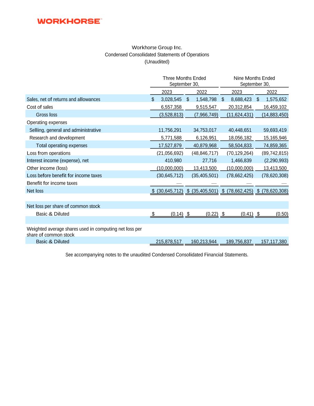 Workhorse Group Inc. Condensed Consolidated Statements of Operations (Unaudited) Three Months Ended September 30, Nine Months Ended September 30, 2023 2022 2023 2022 Sales, net of returns and allowances $ 3,028,545 $ 1,548,798 $ 8,688,423 $ 1,575,652 Cost of sales 6,557,358 9,515,547 20,312,854 16,459,102 Gross loss (3,528,813) (7,966,749) (11,624,431) (14,883,450) Operating expenses Selling, general and administrative 11,756,291 34,753,017 40,448,651 59,693,419 Research and development 5,771,588 6,126,951 18,056,182 15,165,946 Total operating expenses 17,527,879 40,879,968 58,504,833 74,859,365 Loss from operations (21,056,692) (48,846,717) (70,129,264) (89,742,815) Interest income (expense), net 410,980 27,716 1,466,839 (2,290,993) Other income (loss) (10,000,000) 13,413,500 (10,000,000) 13,413,500 Loss before benefit for income taxes (30,645,712) (35,405,501) (78,662,425) (78,620,308) Benefit for income taxes — — — — Net loss $ (30,645,712) $ (35,405,501) $ (78,662,425) $ (78,620,308) Net loss per share of common stock Basic & Diluted $ (0.14) $ (0.22) $ (0.41) $ (0.50) Weighted average shares used in computing net loss per share of common stock Basic & Diluted 215,878,517 160,213,944 189,756,837 157,117,380 See accompanying notes to the unaudited Condensed Consolidated Financial Statements.
