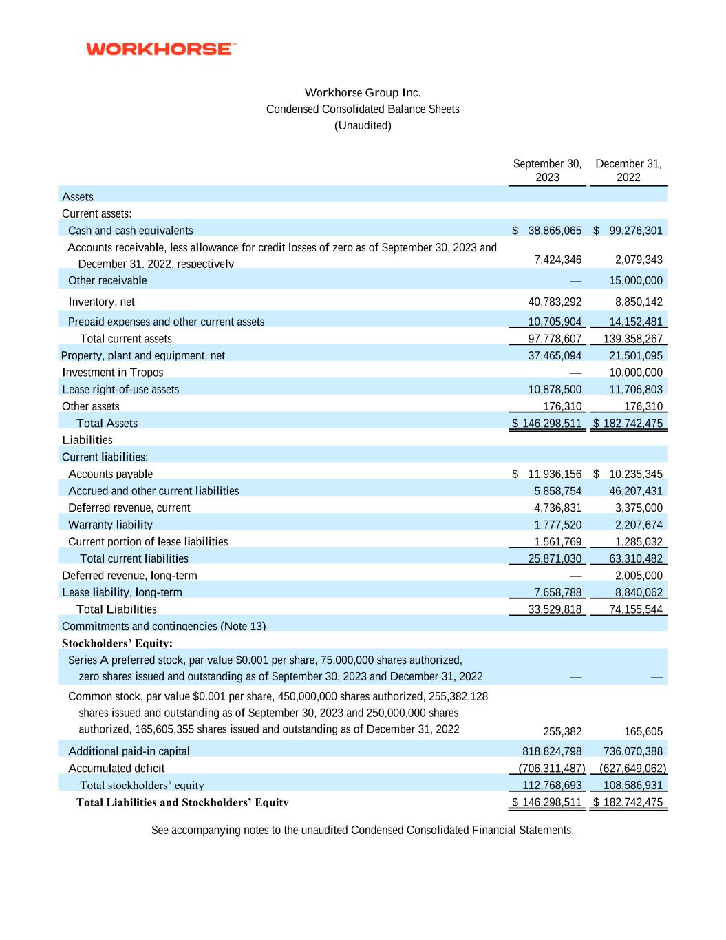 Workhorse Group Inc. Condensed Consolidated Balance Sheets (Unaudited) September 30, 2023 December 31, 2022 Assets Current assets: Cash and cash equivalents $ 38,865,065 $ 99,276,301 Accounts receivable, less allowance for credit losses of zero as of September 30, 2023 and December 31, 2022, respectively 7,424,346 2,079,343 Other receivable — 15,000,000 Inventory, net 40,783,292 8,850,142 Prepaid expenses and other current assets 10,705,904 14,152,481 Total current assets 97,778,607 139,358,267 Property, plant and equipment, net 37,465,094 21,501,095 Investment in Tropos — 10,000,000 Lease right-of-use assets 10,878,500 11,706,803 Other assets 176,310 176,310 Total Assets $ 146,298,511 $ 182,742,475 Liabilities Current liabilities: Accounts payable $ 11,936,156 $ 10,235,345 Accrued and other current liabilities 5,858,754 46,207,431 Deferred revenue, current 4,736,831 3,375,000 Warranty liability 1,777,520 2,207,674 Current portion of lease liabilities 1,561,769 1,285,032 Total current liabilities 25,871,030 63,310,482 Deferred revenue, long-term — 2,005,000 Lease liability, long-term 7,658,788 8,840,062 Total Liabilities 33,529,818 74,155,544 Commitments and contingencies (Note 13) Stockholders’ Equity: Series A preferred stock, par value $0.001 per share, 75,000,000 shares authorized, zero shares issued and outstanding as of September 30, 2023 and December 31, 2022 — — Common stock, par value $0.001 per share, 450,000,000 shares authorized, 255,382,128 shares issued and outstanding as of September 30, 2023 and 250,000,000 shares authorized, 165,605,355 shares issued and outstanding as of December 31, 2022 255,382 165,605 Additional paid-in capital 818,824,798 736,070,388 Accumulated deficit (706,311,487) (627,649,062) Total stockholders’ equity 112,768,693 108,586,931 Total Liabilities and Stockholders’ Equity $ 146,298,511 $ 182,742,475 See accompanying notes to the unaudited Condensed Consolidated Financial Statements.