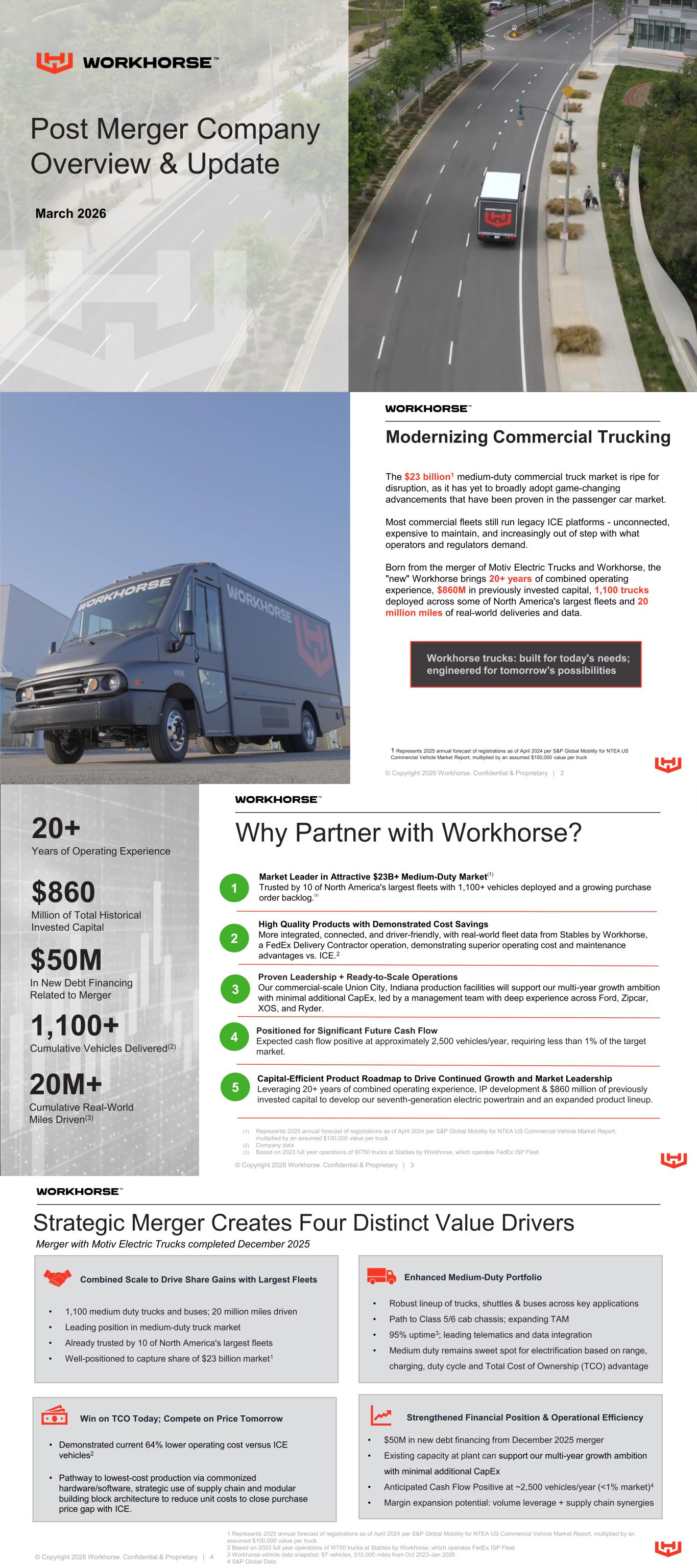 © 2025 Workhorse Group Inc. – Confidential and Proprietary | 1 Post Merger Company Overview & Update March 2026 © Copyright 2026 Workhorse. Confidential & Proprietary | 2 © Copyright 2026 Workhorse. Confidential & Proprietary | 2 Modernizing Commercial Trucking The $23 billion1 medium-duty commercial truck market is ripe for disruption, as it has yet to broadly adopt game-changing advancements that have been proven in the passenger car market. Most commercial fleets still run legacy ICE platforms - unconnected, expensive to maintain, and increasingly out of step with what operators and regulators demand. Born from the merger of Motiv Electric Trucks and Workhorse, the "new" Workhorse brings 20+ years of combined operating experience, $860M in previously invested capital, 1,100 trucks deployed across some of North America's largest fleets and 20 million miles of real-world deliveries and data. Workhorse trucks: built for today's needs; engineered for tomorrow's possibilities 1 Represents 2025 annual forecast of registrations as of April 2024 per S&P Global Mobility for NTEA US Commercial Vehicle Market Report, multiplied by an assumed $100,000 value per truck © Copyright 2026 Workhorse. Confidential & Proprietary | 3 $85M New Capital Infusion ~1,000 Cumulative Vehicles Delivered(2) Why Partner with Workhorse? 1 2 4 5 (1) Represents 2025 annual forecast of registrations as of April 2024 per S&P Global Mobility for NTEA US Commercial Vehicle Market Report, multiplied by an assumed $100,000 value per truck (2) Company data (3) Based on 2023 full year operations of W750 trucks at Stables by Workhorse, which operates FedEx ISP Fleet 3 20M+ Cumulative Real-World Miles Driven(3) $50M In New Debt Financing Related to Merger 1,100+ Cumulative Vehicles Delivered(2) Market Leader in Attractive $23B+ Medium-Duty Market(1) Trusted by 10 of North America's largest fleets with 1,100+ vehicles deployed and a growing purchase order backlog. (2) High Quality Products with Demonstrated Cost Savings More integrated, connected, and driver-friendly, with real-world fleet data from Stables by Workhorse, a FedEx Delivery Contractor operation, demonstrating superior operating cost and maintenance advantages vs. ICE.2 Proven Leadership + Ready-to-Scale Operations Our commercial-scale Union City, Indiana production facilities will support our multi-year growth ambition with minimal additional CapEx, led by a management team with deep experience across Ford, Zipcar, XOS, and Ryder. 20+ Years of Operating Experience $860 Million of Total Historical Invested Capital Capital-Efficient Product Roadmap to Drive Continued Growth and Market Leadership Leveraging 20+ years of combined operating experience, IP development & $860 million of previously invested capital to develop our seventh-generation electric powertrain and an expanded product lineup. Positioned for Significant Future Cash Flow Expected cash flow positive at approximately 2,500 vehicles/year, requiring less than 1% of the target market. © Copyright 2026 Workhorse. Confidential & Proprietary | 4 Strategic Merger Creates Four Distinct Value Drivers Merger with Motiv Electric Trucks completed December 2025 Combined Scale to Drive Share Gains with Largest Fleets • 1,100 medium duty trucks and buses; 20 million miles driven • Leading position in medium-duty truck market • Already trusted by 10 of North America's largest fleets • Well-positioned to capture share of $23 billion market1 Enhanced Medium-Duty Portfolio Win on TCO Today; Compete on Price Tomorrow Strengthened Financial Position & Operational Efficiency • $50M in new debt financing from December 2025 merger • Existing capacity at plant can support our multi-year growth ambition with minimal additional CapEx • Anticipated Cash Flow Positive at ~2,500 vehicles/year (<1% market)4 • Margin expansion potential: volume leverage + supply chain synergies • Robust lineup of trucks, shuttles & buses across key applications • Path to Class 5/6 cab chassis; expanding TAM • 95% uptime3; leading telematics and data integration • Medium duty remains sweet spot for electrification based on range, charging, duty cycle and Total Cost of Ownership (TCO) advantage • Demonstrated current 64% lower operating cost versus ICE vehicles2 • Pathway to lowest-cost production via commonized hardware/software, strategic use of supply chain and modular building block architecture to reduce unit costs to close purchase price gap with ICE. 1 Represents 2025 annual forecast of registrations as of April 2024 per S&P Global Mobility for NTEA US Commercial Vehicle Market Report, multiplied by an assumed $100,000 value per truck 2 Based on 2023 full year operations of W750 trucks at Stables by Workhorse, which operates FedEx ISP Fleet 3 Workhorse vehicle data snapshot: 87 vehicles, 510,000 miles from Oct 2023-Jan 2026 4 S&P Global Data
