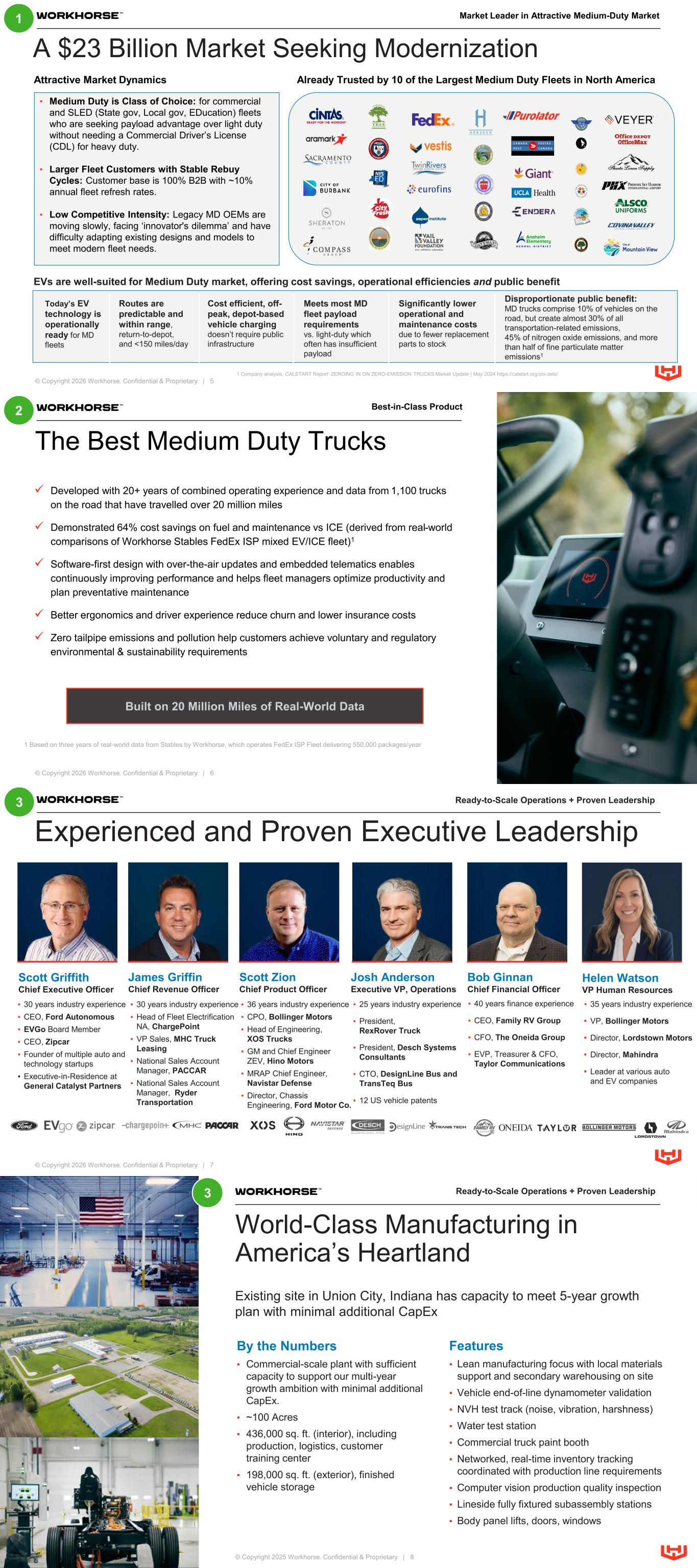 © Copyright 2026 Workhorse. Confidential & Proprietary | 5 • Medium Duty is Class of Choice: for commercial and SLED (State gov, Local gov, EDucation) fleets who are seeking payload advantage over light duty without needing a Commercial Driver’s License (CDL) for heavy duty. • Larger Fleet Customers with Stable Rebuy Cycles: Customer base is 100% B2B with ~10% annual fleet refresh rates. • Low Competitive Intensity: Legacy MD OEMs are moving slowly, facing ‘innovator's dilemma’ and have difficulty adapting existing designs and models to meet modern fleet needs. Today’s EV technology is operationally ready for MD fleets Routes are predictable and within range, return-to-depot, and <150 miles/day Cost efficient, off- peak, depot-based vehicle charging doesn’t require public infrastructure Meets most MD fleet payload requirements vs. light-duty which often has insufficient payload Significantly lower operational and maintenance costs due to fewer replacement parts to stock Disproportionate public benefit: MD trucks comprise 10% of vehicles on the road, but create almost 30% of all transportation-related emissions, 45% of nitrogen oxide emissions, and more than half of fine particulate matter emissions1 1 A $23 Billion Market Seeking Modernization Market Leader in Attractive Medium-Duty Market Already Trusted by 10 of the Largest Medium Duty Fleets in North AmericaAttractive Market Dynamics EVs are well-suited for Medium Duty market, offering cost savings, operational efficiencies and public benefit 1 Company analysis, CALSTART Report: ZEROING IN ON ZERO-EMISSION TRUCKS Market Update | May 2024 https://calstart.org/zio-zets/. © Copyright 2026 Workhorse. Confidential & Proprietary | 6 The Best Medium Duty Trucks ✓ Developed with 20+ years of combined operating experience and data from 1,100 trucks on the road that have travelled over 20 million miles ✓ Demonstrated 64% cost savings on fuel and maintenance vs ICE (derived from real-world comparisons of Workhorse Stables FedEx ISP mixed EV/ICE fleet)1 ✓ Software-first design with over-the-air updates and embedded telematics enables continuously improving performance and helps fleet managers optimize productivity and plan preventative maintenance ✓ Better ergonomics and driver experience reduce churn and lower insurance costs ✓ Zero tailpipe emissions and pollution help customers achieve voluntary and regulatory environmental & sustainability requirements Best-in-Class Product2 Built on 20 Million Miles of Real-World Data 1 Based on three years of real-world data from Stables by Workhorse, which operates FedEx ISP Fleet delivering 550,000 packages/year © Copyright 2026 Workhorse. Confidential & Proprietary | 7 ▪ 40 years finance experience ▪ CEO, Family RV Group ▪ CFO, The Oneida Group ▪ EVP, Treasurer & CFO, Taylor Communications Experienced and Proven Executive Leadership Ready-to-Scale Operations + Proven Leadership Scott Griffith Chief Executive Officer Scott Zion Chief Product Officer James Griffin Chief Revenue Officer Josh Anderson Executive VP, Operations Bob Ginnan Chief Financial Officer ▪ 30 years industry experience ▪ CEO, Ford Autonomous ▪ EVGo Board Member ▪ CEO, Zipcar ▪ Founder of multiple auto and technology startups ▪ Executive-in-Residence at General Catalyst Partners ▪ 30 years industry experience ▪ Head of Fleet Electrification NA, ChargePoint ▪ VP Sales, MHC Truck Leasing ▪ National Sales Account Manager, PACCAR ▪ National Sales Account Manager, Ryder Transportation ▪ 25 years industry experience ▪ President, RexRover Truck ▪ President, Desch Systems Consultants ▪ CTO, DesignLine Bus and TransTeq Bus ▪ 12 US vehicle patents ▪ 36 years industry experience ▪ CPO, Bollinger Motors ▪ Head of Engineering, XOS Trucks ▪ GM and Chief Engineer ZEV, Hino Motors ▪ MRAP Chief Engineer, Navistar Defense ▪ Director, Chassis Engineering, Ford Motor Co. ▪ 35 years industry experience ▪ VP, Bollinger Motors ▪ Director, Lordstown Motors ▪ Director, Mahindra ▪ Leader at various auto and EV companies 3 Helen Watson VP Human Resources © Copyright 2025 Workhorse. Confidential & Proprietary | 8 World-Class Manufacturing in America’s Heartland By the Numbers ▪ Commercial-scale plant with sufficient capacity to support our multi-year growth ambition with minimal additional CapEx. ▪ ~100 Acres ▪ 436,000 sq. ft. (interior), including production, logistics, customer training center ▪ 198,000 sq. ft. (exterior), finished vehicle storage Features ▪ Lean manufacturing focus with local materials support and secondary warehousing on site ▪ Vehicle end-of-line dynamometer validation ▪ NVH test track (noise, vibration, harshness) ▪ Water test station ▪ Commercial truck paint booth ▪ Networked, real-time inventory tracking coordinated with production line requirements ▪ Computer vision production quality inspection ▪ Lineside fully fixtured subassembly stations ▪ Body panel lifts, doors, windows 3 Existing site in Union City, Indiana has capacity to meet 5-year growth plan with minimal additional CapEx Ready-to-Scale Operations + Proven Leadership