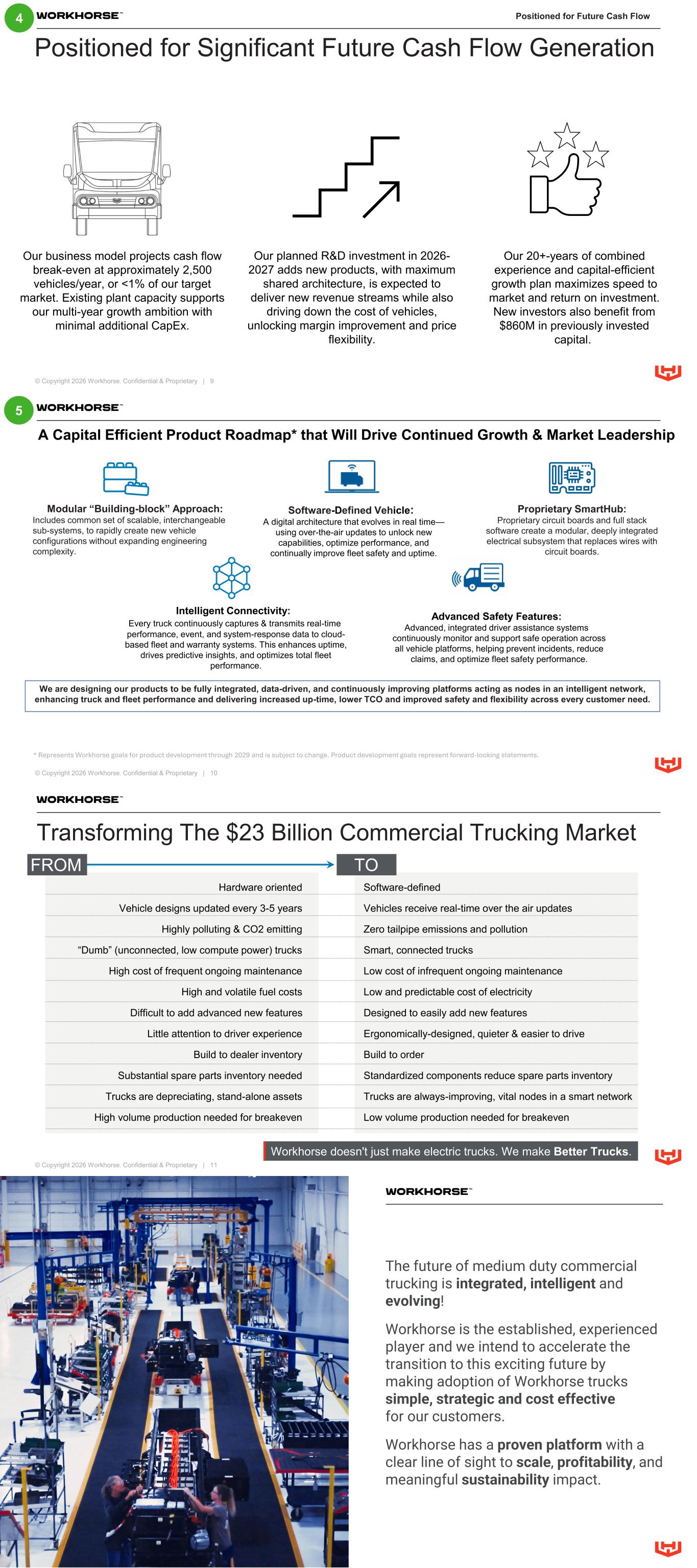 © Copyright 2026 Workhorse. Confidential & Proprietary | 9 Positioned for Significant Future Cash Flow Generation 4 Positioned for Future Cash Flow Our 20+-years of combined experience and capital-efficient growth plan maximizes speed to market and return on investment. New investors also benefit from $860M in previously invested capital. Our business model projects cash flow break-even at approximately 2,500 vehicles/year, or <1% of our target market. Existing plant capacity supports our multi-year growth ambition with minimal additional CapEx. Our planned R&D investment in 2026- 2027 adds new products, with maximum shared architecture, is expected to deliver new revenue streams while also driving down the cost of vehicles, unlocking margin improvement and price flexibility. © Copyright 2026 Workhorse. Confidential & Proprietary | 10 Advanced Safety Features: Advanced, integrated driver assistance systems continuously monitor and support safe operation across all vehicle platforms, helping prevent incidents, reduce claims, and optimize fleet safety performance. Intelligent Connectivity: Every truck continuously captures & transmits real-time performance, event, and system-response data to cloud- based fleet and warranty systems. This enhances uptime, drives predictive insights, and optimizes total fleet performance. Software-Defined Vehicle: A digital architecture that evolves in real time— using over-the-air updates to unlock new capabilities, optimize performance, and continually improve fleet safety and uptime. Proprietary SmartHub: Proprietary circuit boards and full stack software create a modular, deeply integrated electrical subsystem that replaces wires with circuit boards. Modular “Building-block” Approach: Includes common set of scalable, interchangeable sub-systems, to rapidly create new vehicle configurations without expanding engineering complexity. 5 We are designing our products to be fully integrated, data-driven, and continuously improving platforms acting as nodes in an intelligent network, enhancing truck and fleet performance and delivering increased up-time, lower TCO and improved safety and flexibility across every customer need. A Capital Efficient Product Roadmap* that Will Drive Continued Growth & Market Leadership * Represents Workhorse goals for product development through 2029 and is subject to change. Product development goals represent forward-looking statements. © Copyright 2026 Workhorse. Confidential & Proprietary | 11 Transforming The $23 Billion Commercial Trucking Market Workhorse doesn't just make electric trucks. We make Better Trucks. Hardware oriented Vehicle designs updated every 3-5 years Highly polluting & CO2 emitting “Dumb” (unconnected, low compute power) trucks High cost of frequent ongoing maintenance High and volatile fuel costs Difficult to add advanced new features Little attention to driver experience Build to dealer inventory Substantial spare parts inventory needed Trucks are depreciating, stand-alone assets High volume production needed for breakeven Software-defined Vehicles receive real-time over the air updates Zero tailpipe emissions and pollution Smart, connected trucks Low cost of infrequent ongoing maintenance Low and predictable cost of electricity Designed to easily add new features Ergonomically-designed, quieter & easier to drive Build to order Standardized components reduce spare parts inventory Trucks are always-improving, vital nodes in a smart network Low volume production needed for breakeven FROM TO © Copyright 2026 Workhorse. Confidential & Proprietary | 12 The future of medium duty commercial trucking is integrated, intelligent and evolving! Workhorse is the established, experienced player and we intend to accelerate the transition to this exciting future by making adoption of Workhorse trucks simple, strategic and cost effective for our customers. Workhorse has a proven platform with a clear line of sight to scale, profitability, and meaningful sustainability impact.