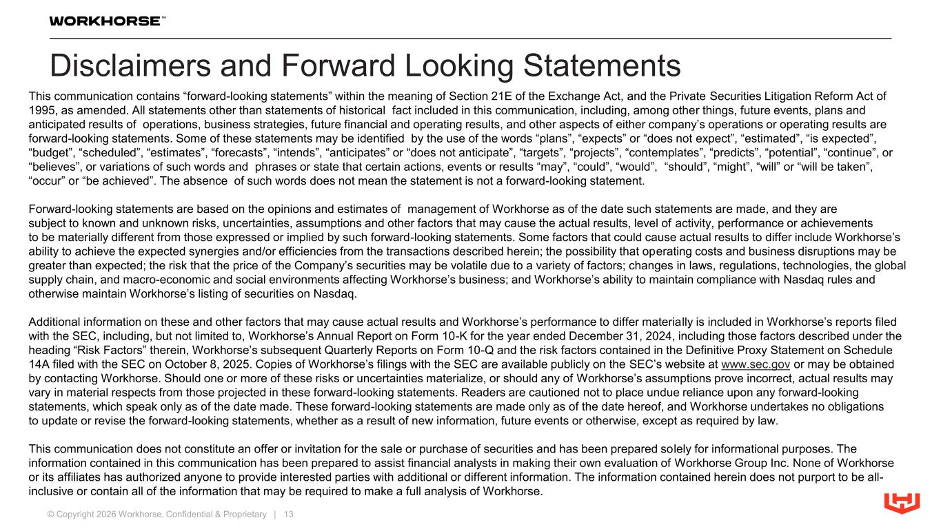 © Copyright 2026 Workhorse. Confidential & Proprietary | 13 Disclaimers and Forward Looking Statements This communication contains “forward-looking statements” within the meaning of Section 21E of the Exchange Act, and the Private Securities Litigation Reform Act of 1995, as amended. All statements other than statements of historical fact included in this communication, including, among other things, future events, plans and anticipated results of operations, business strategies, future financial and operating results, and other aspects of either company’s operations or operating results are forward-looking statements. Some of these statements may be identified by the use of the words “plans”, “expects” or “does not expect”, “estimated”, “is expected”, “budget”, “scheduled”, “estimates”, “forecasts”, “intends”, “anticipates” or “does not anticipate”, “targets”, “projects”, “contemplates”, “predicts”, “potential”, “continue”, or “believes”, or variations of such words and phrases or state that certain actions, events or results “may”, “could”, “would”, “should”, “might”, “will” or “will be taken”, “occur” or “be achieved”. The absence of such words does not mean the statement is not a forward-looking statement. Forward-looking statements are based on the opinions and estimates of management of Workhorse as of the date such statements are made, and they are subject to known and unknown risks, uncertainties, assumptions and other factors that may cause the actual results, level of activity, performance or achievements to be materially different from those expressed or implied by such forward-looking statements. Some factors that could cause actual results to differ include Workhorse’s ability to achieve the expected synergies and/or efficiencies from the transactions described herein; the possibility that operating costs and business disruptions may be greater than expected; the risk that the price of the Company’s securities may be volatile due to a variety of factors; changes in laws, regulations, technologies, the global supply chain, and macro-economic and social environments affecting Workhorse’s business; and Workhorse’s ability to maintain compliance with Nasdaq rules and otherwise maintain Workhorse’s listing of securities on Nasdaq. Additional information on these and other factors that may cause actual results and Workhorse’s performance to differ materially is included in Workhorse’s reports filed with the SEC, including, but not limited to, Workhorse’s Annual Report on Form 10-K for the year ended December 31, 2024, including those factors described under the heading “Risk Factors” therein, Workhorse’s subsequent Quarterly Reports on Form 10-Q and the risk factors contained in the Definitive Proxy Statement on Schedule 14A filed with the SEC on October 8, 2025. Copies of Workhorse’s filings with the SEC are available publicly on the SEC’s website at www.sec.gov or may be obtained by contacting Workhorse. Should one or more of these risks or uncertainties materialize, or should any of Workhorse’s assumptions prove incorrect, actual results may vary in material respects from those projected in these forward-looking statements. Readers are cautioned not to place undue reliance upon any forward-looking statements, which speak only as of the date made. These forward-looking statements are made only as of the date hereof, and Workhorse undertakes no obligations to update or revise the forward-looking statements, whether as a result of new information, future events or otherwise, except as required by law. This communication does not constitute an offer or invitation for the sale or purchase of securities and has been prepared solely for informational purposes. The information contained in this communication has been prepared to assist financial analysts in making their own evaluation of Workhorse Group Inc. None of Workhorse or its affiliates has authorized anyone to provide interested parties with additional or different information. The information contained herein does not purport to be all- inclusive or contain all of the information that may be required to make a full analysis of Workhorse.